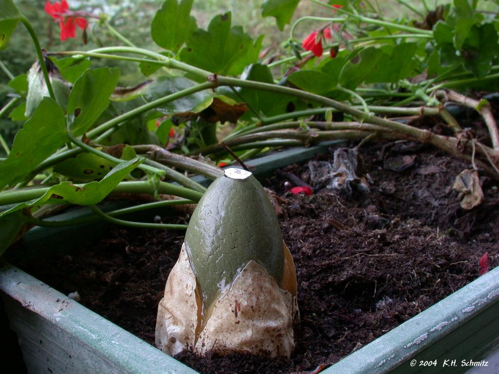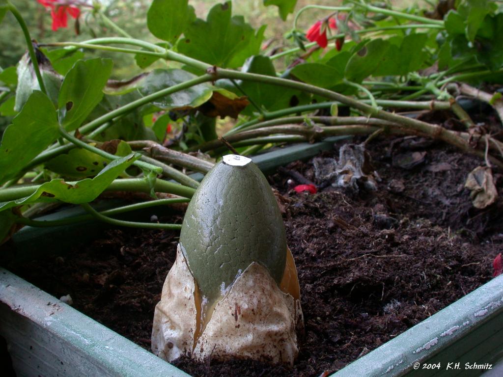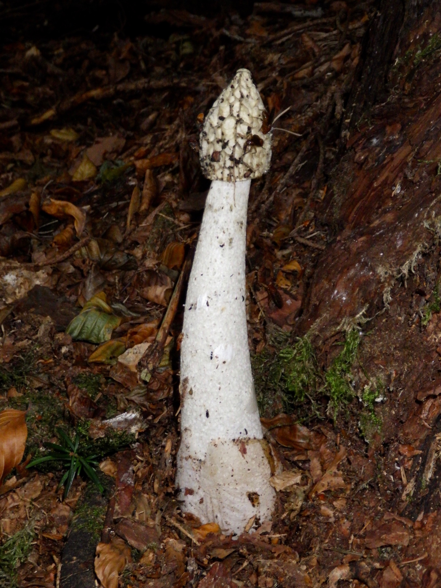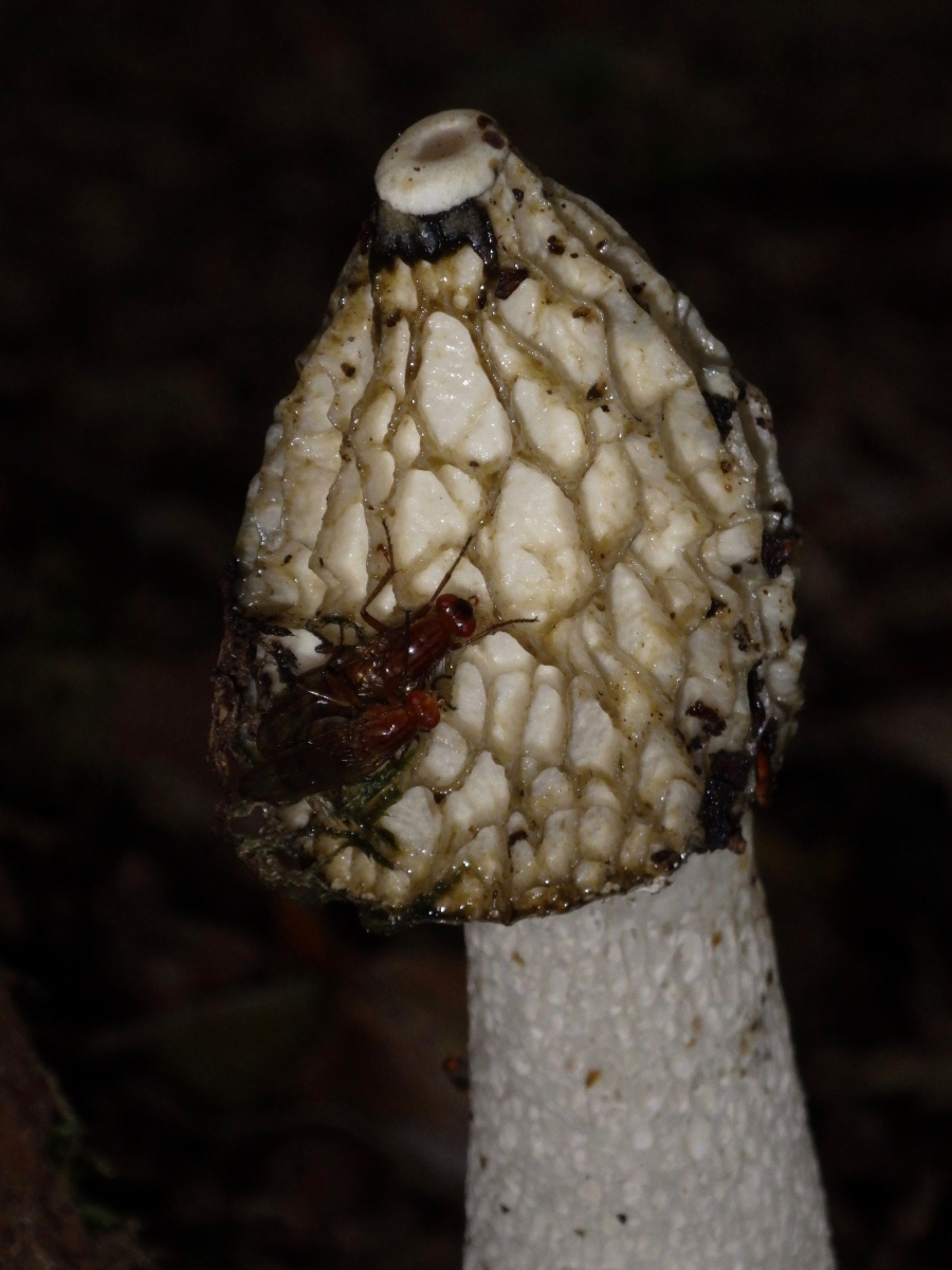 Bild 3: Am gleichen Tag aber 8h später (16.30 Uhr), der Pilz war nun 20cm hoch gewachsen und das Velum am Hut war durch die angelockten Insekten fast vollständig weggefressen, der Pilz roch aber immer noch widerlich nach Aas! Das Sporenmaterial wurde dadurch durch die Insekten erfolgreich verbreitet.