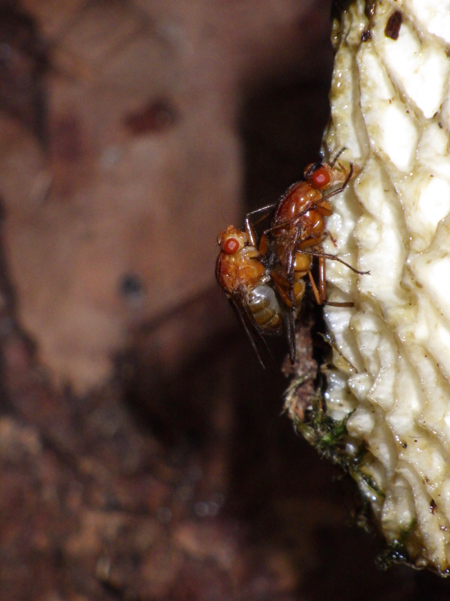 Bild 4 und 5: Dungfliegen verpaaren sich während dem Fressen sogar noch auf dem stinkendem Pilz.
