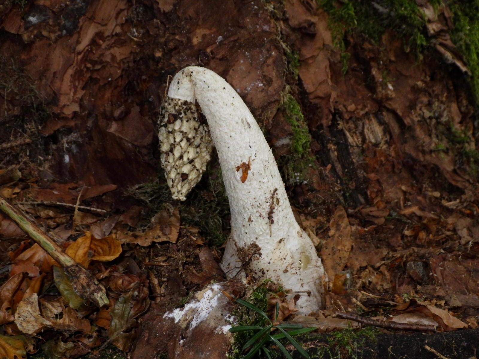 Bild 3: Am gleichen Tag aber 8h später (16.30 Uhr), der Pilz war nun 20cm hoch gewachsen und das Velum am Hut war durch die angelockten Insekten fast vollständig weggefressen, der Pilz roch aber immer noch widerlich nach Aas! Das Sporenmaterial wurde dadurch durch die Insekten erfolgreich verbreitet.