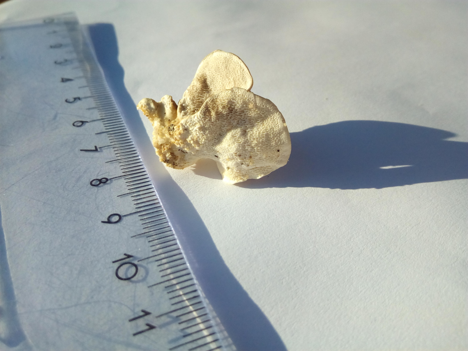Also mal ein Pilz mit rein weißem Fleisch und zwar unregelmäßigen, aber +/- ganzrandigen, recht groben Poren.Ich denke, daß ist eine Trametes - Art. Dazu passta cuh deine Beschreibung der Konsistenz. Allerdings besteht hier die Möglichkeit, daß der Fruchtkörper in einigen Punkten untypisch ausgebildet ist.