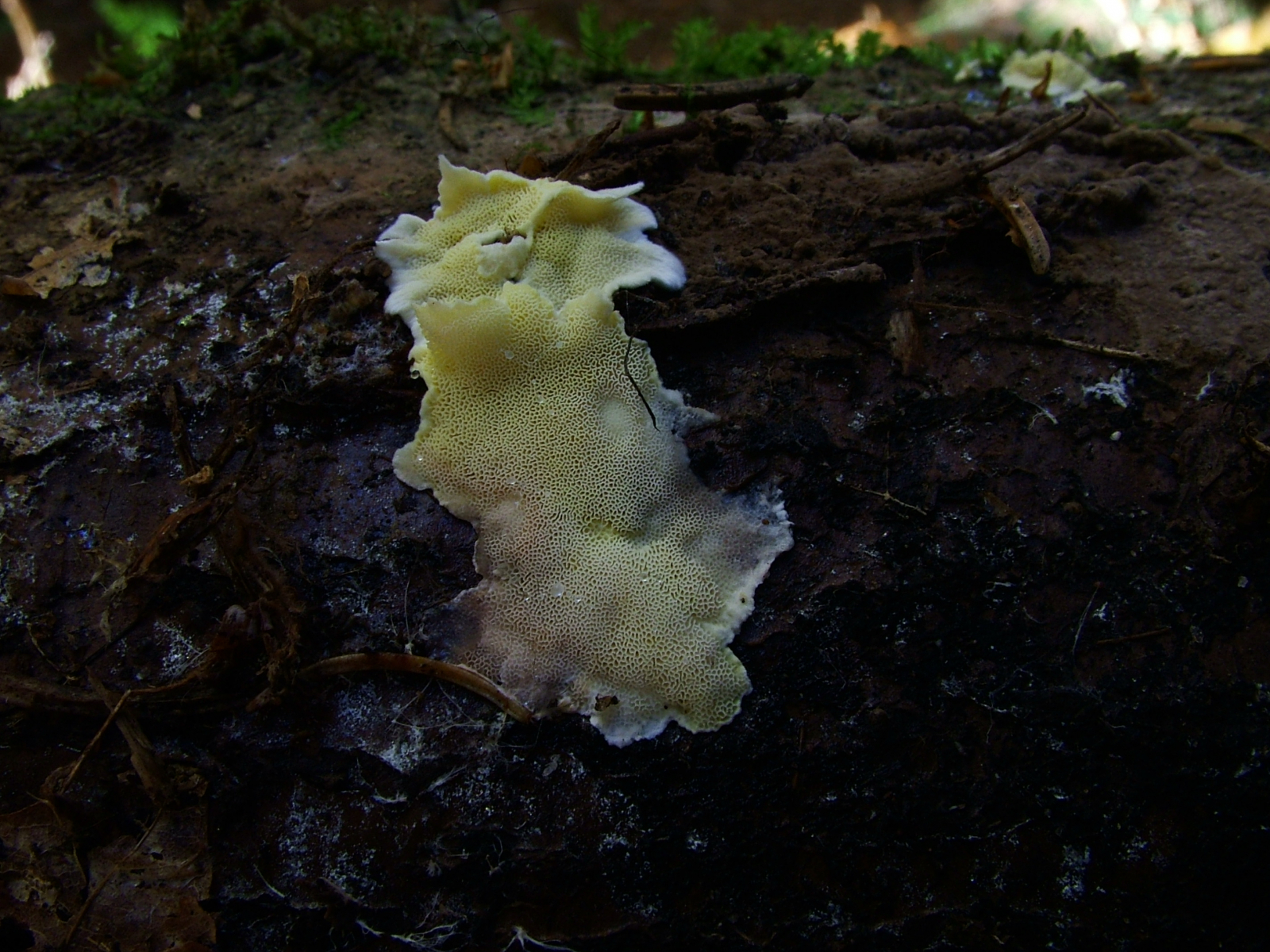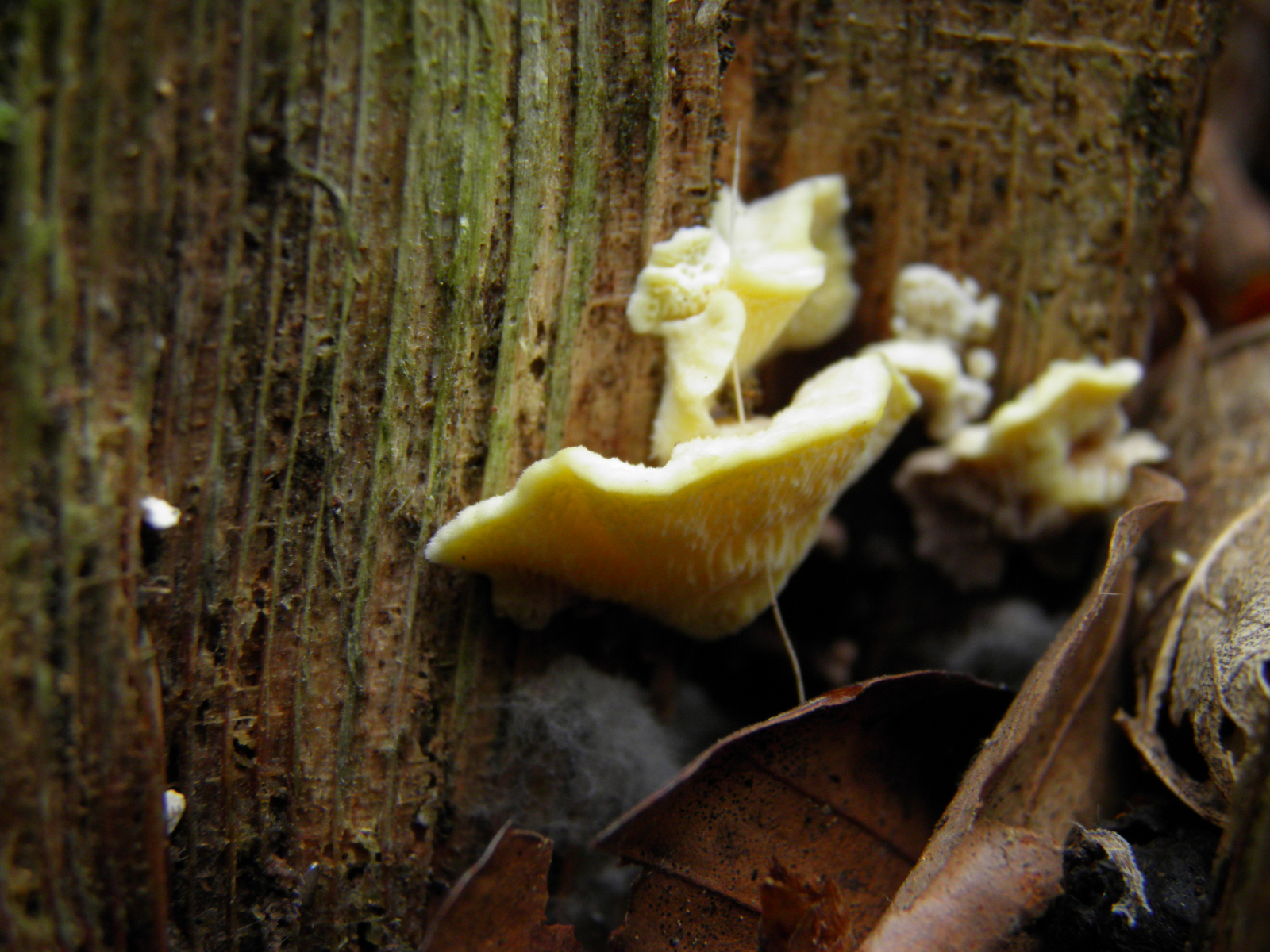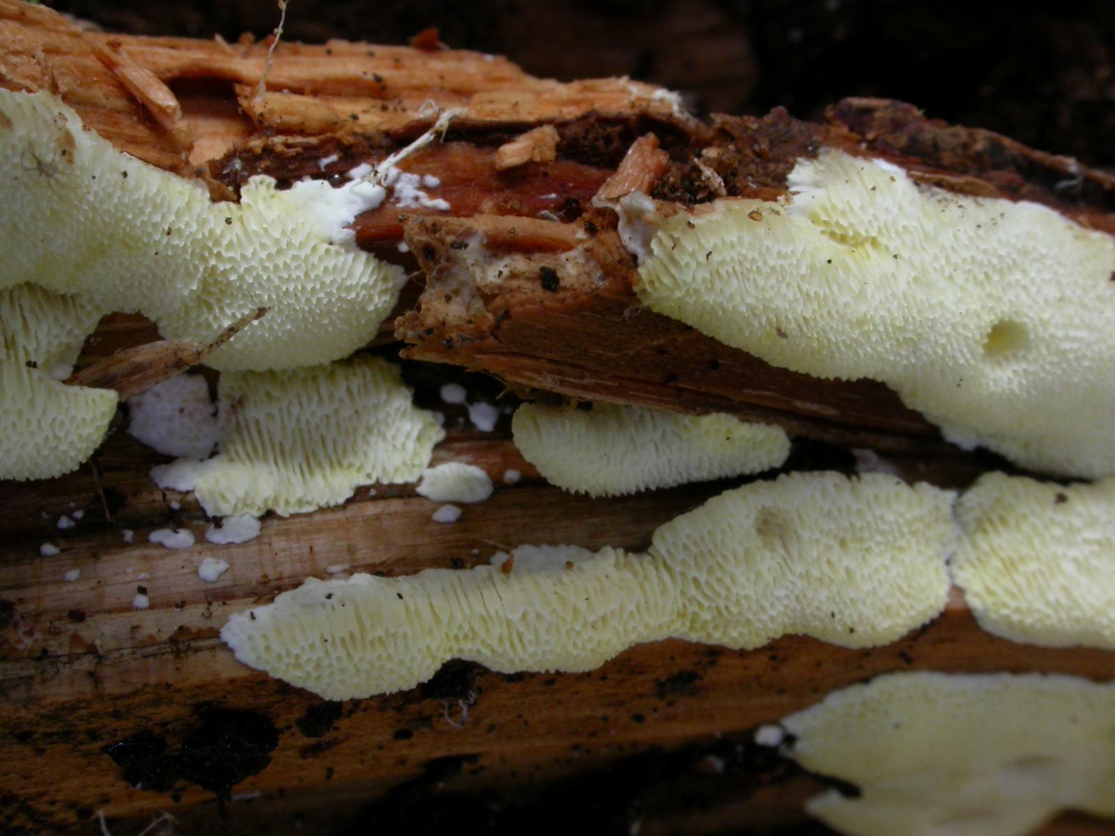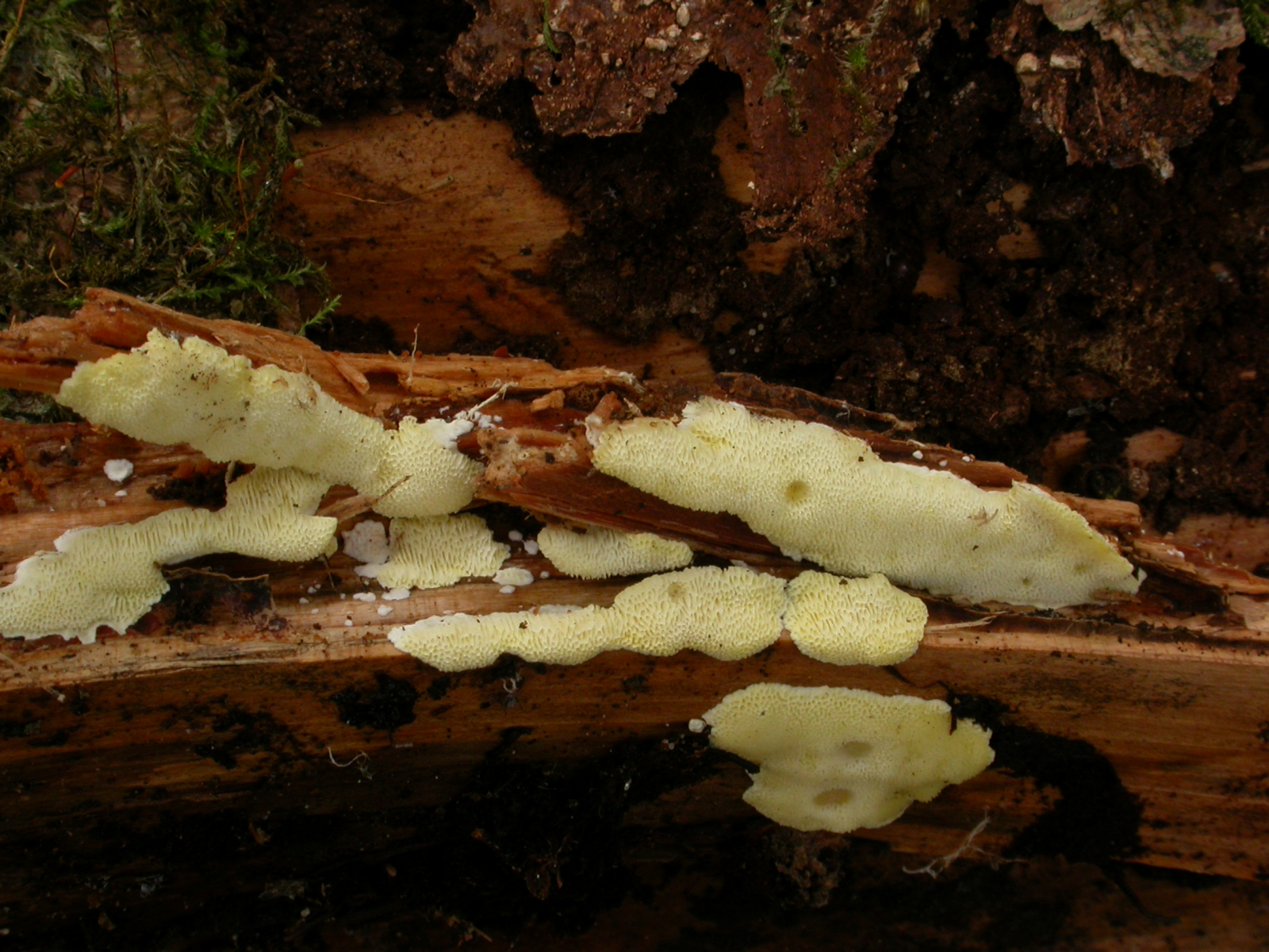 Gefreut hab ich mich heute über einen erneuten Fund von Antrodiella citrinella. Heuer im Februar hab ich sie auf den gleichen Fichtenstümpfen schon einmal gefunden (von Pablo mirkoskopisch bestimmt), jetzt im Oktober gibt es schon wieder neue Fruchtkörper.