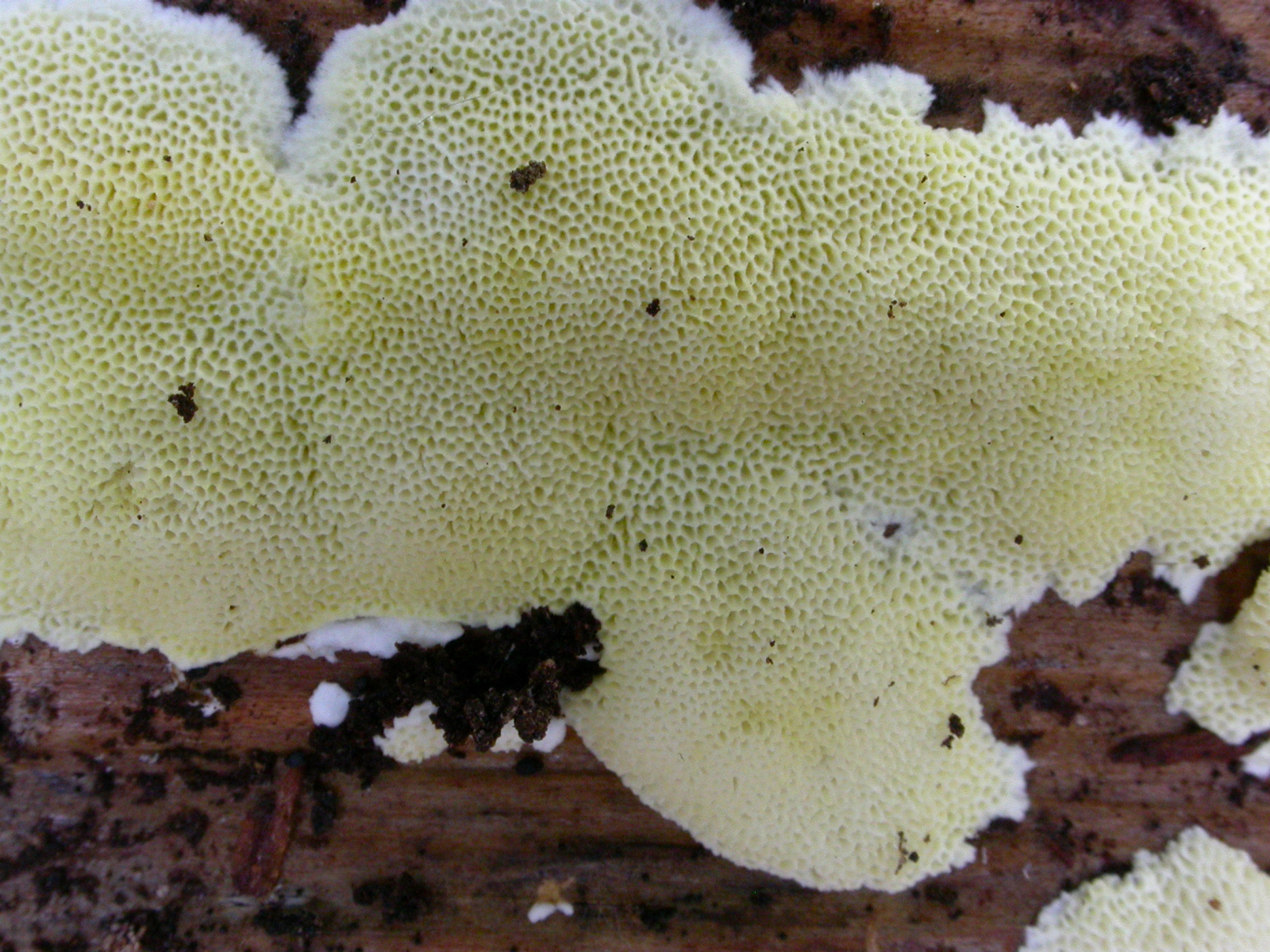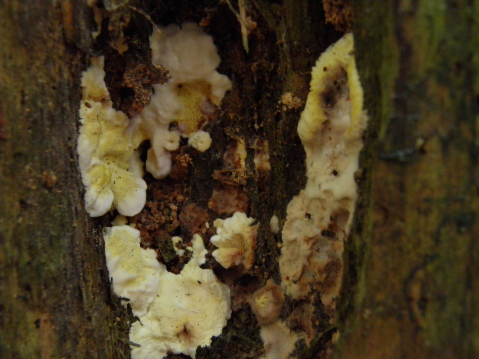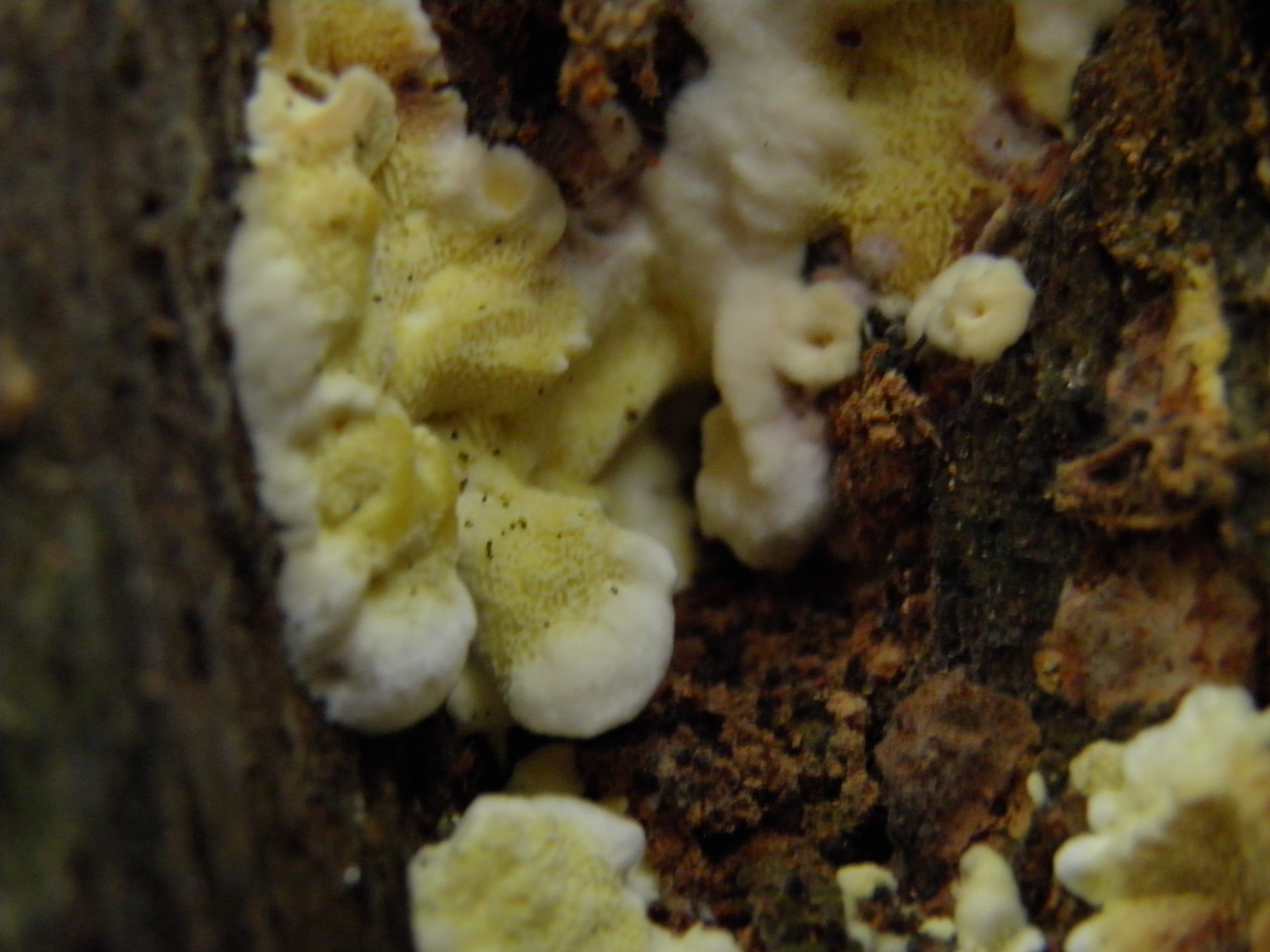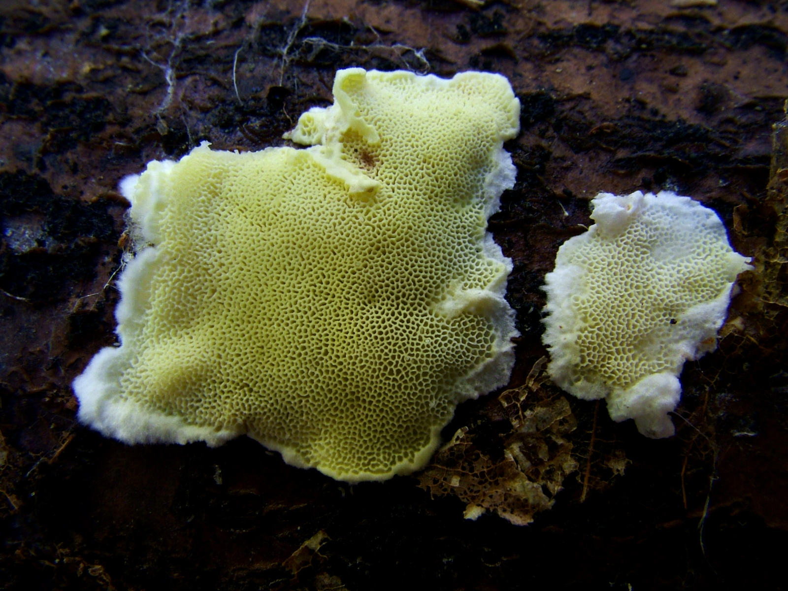 Gefreut hab ich mich heute über einen erneuten Fund von Antrodiella citrinella. Heuer im Februar hab ich sie auf den gleichen Fichtenstümpfen schon einmal gefunden (von Pablo mirkoskopisch bestimmt), jetzt im Oktober gibt es schon wieder neue Fruchtkörper.