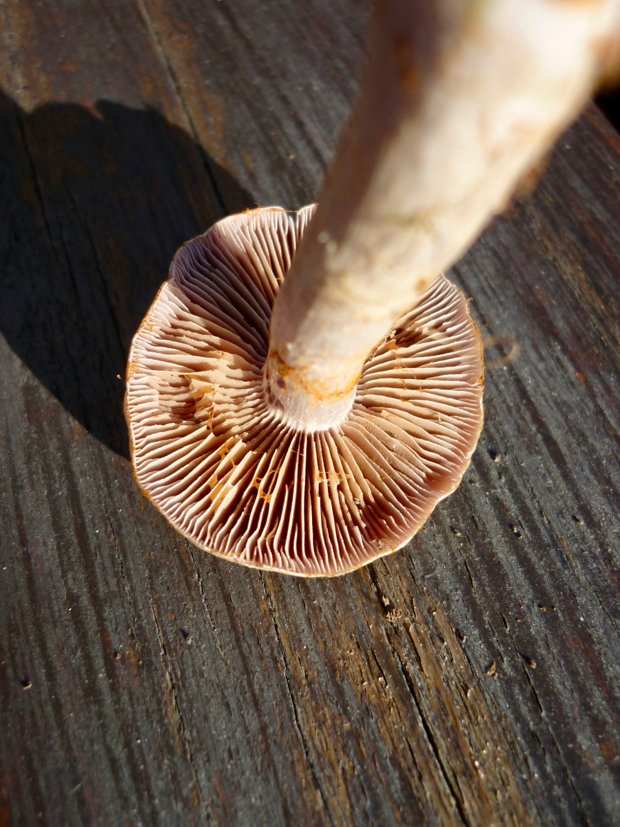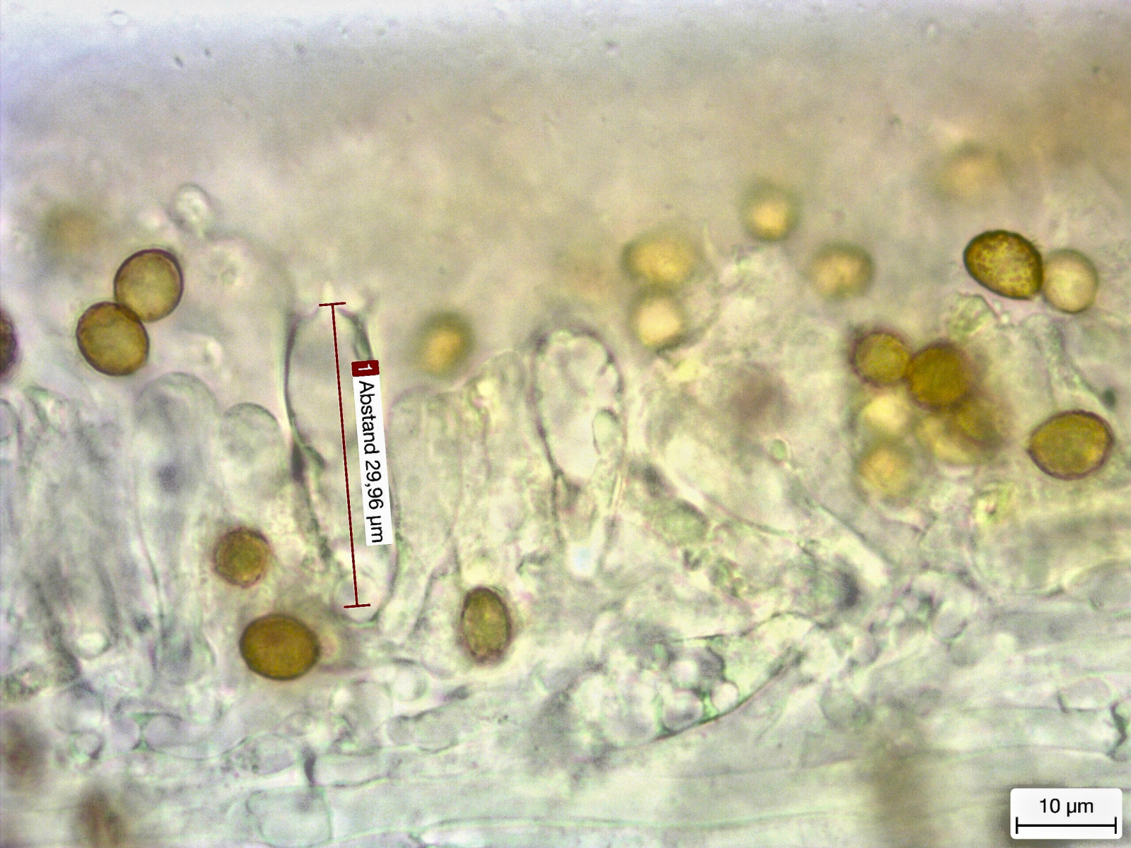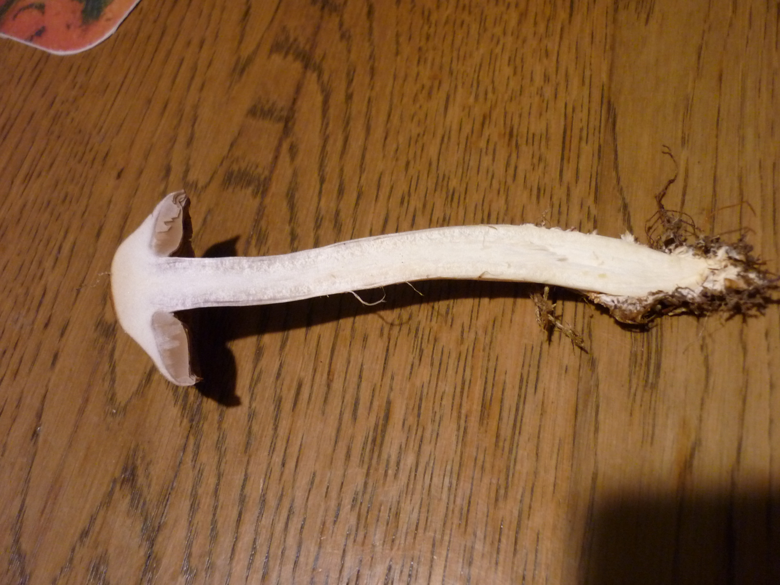 Hutdurchmesser 4 cm, grau-beige, leicht gebuckelt, in der Mitte etwas dunkler, helle Lamellenschneiden, grau-braun, angewachsen, mit einem Stich ins Violette, freudig braune Cortinareste, Sporen feinwarzig, Stiel ca.10 cm lang, Fleisch weiß mild, Geruch etwas erdig, Geschmack mild, angenehm, Stiel glatt feinstreifig, glänzend, zur Stielspitze hin etwas verjüngend.
