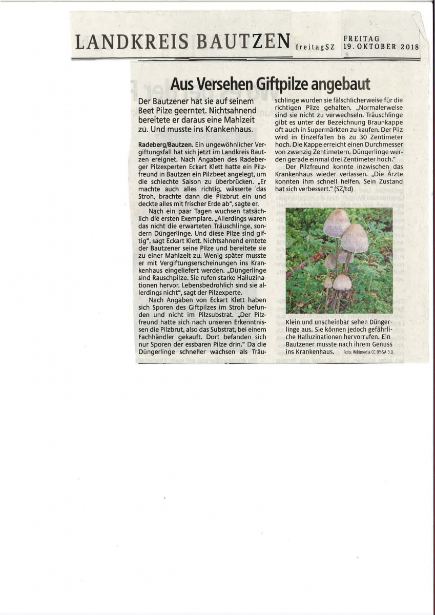die Story kenne ich schon. Mich wundert nur, dass Eckart die rausgekramt hat, anstatt der PSV, der den Vergiftungsfall auch bearbeitet hat. Auch finde ich die Darstellung in der Zeitung nicht ganz zutreffend. Ja ein Pilzinteressierter hat sich ein "Pilzbeet" für Riesenträuschlinge angelegt und ja auf dem Pilzbeet sind Dunkelrandige Düngerlinge gewachsen; warum auch nicht, gerade wenn im Substrat auch noch Pferderdung eingearbeitet worden war.