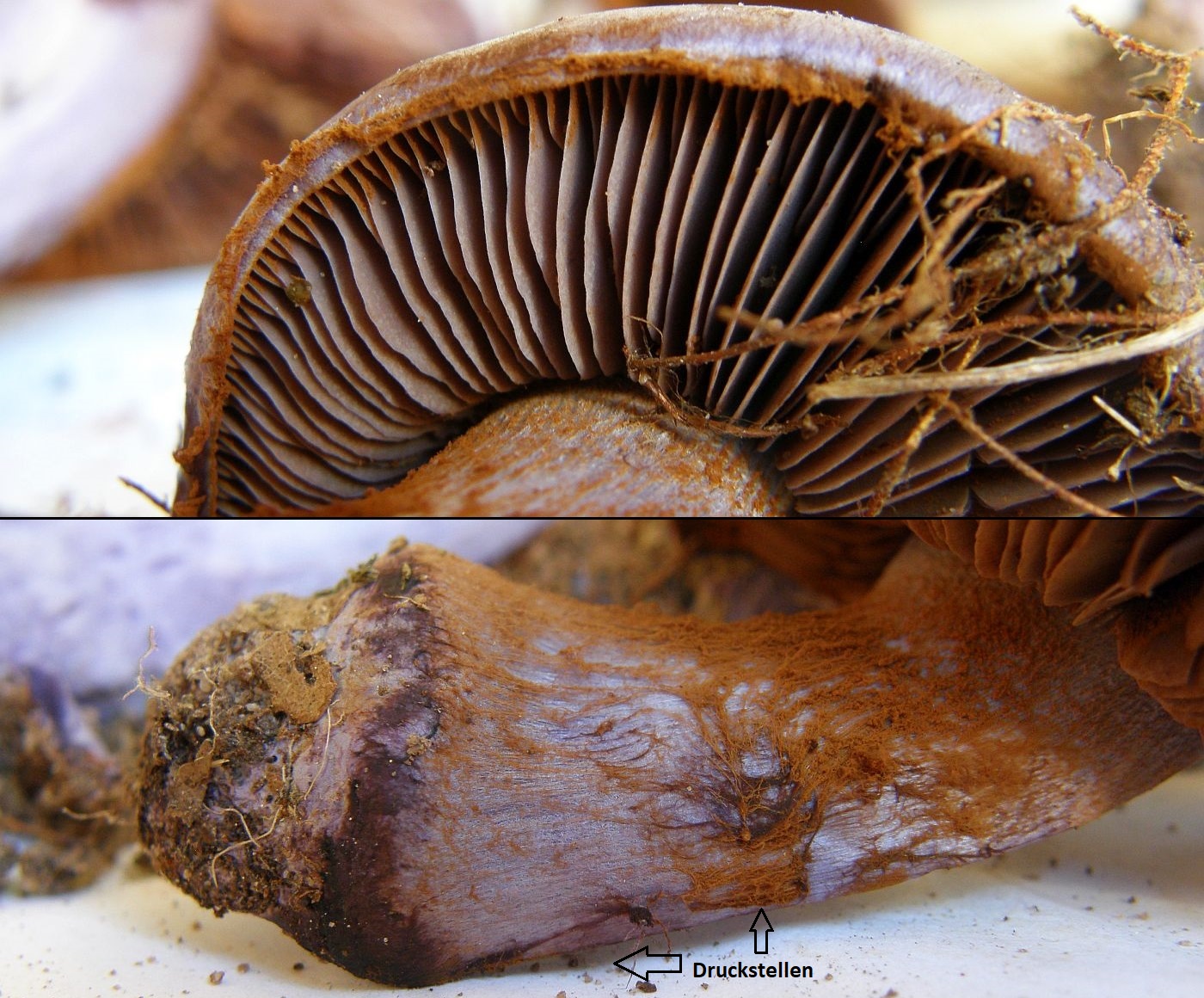 Hutoberfläche nur frisch mit schwachen violettönen am Hutrand, teils aber etwas fleckend nach Berührung.
