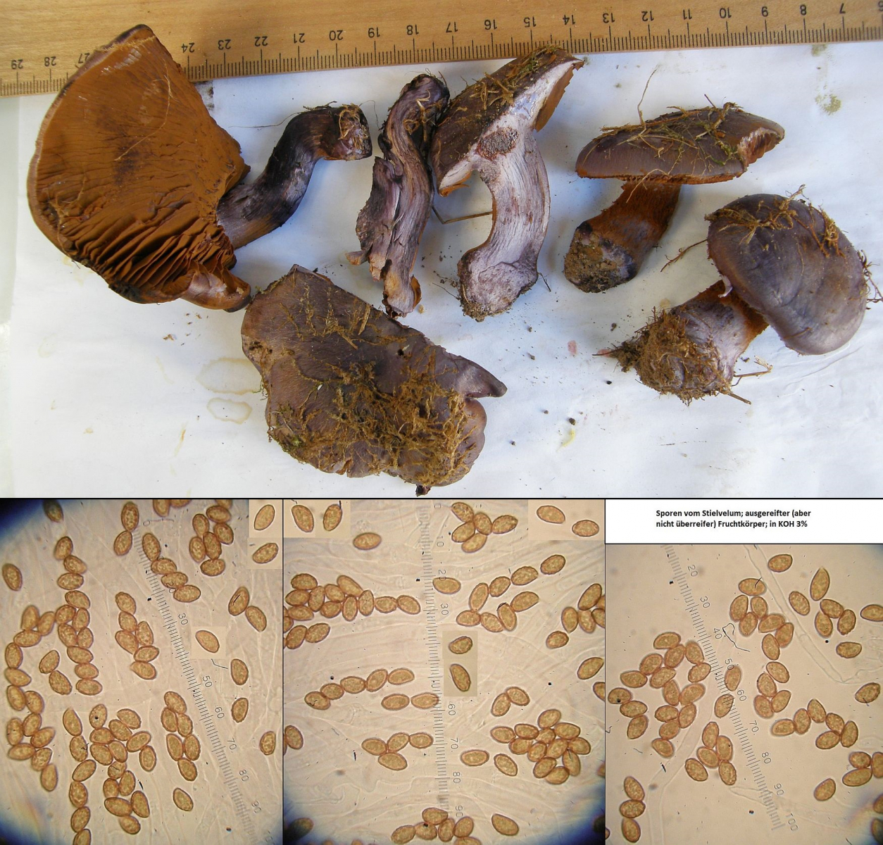 Diese Kollektion kann ich mit dem Schlüssel aus Funga Nordica nicht erreichen. Mit dem Schlüssel von Andreas Gminder in GPBW Band5 komme ich wackelnd und schliengernd zu Cortiarius occidentalis. Zu der Art finde ich aber kaum weitere, belastbare Informationen. Sollte aber im Grunde auch nicht so eine intensive Hutfarbe haben?