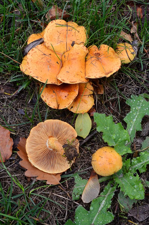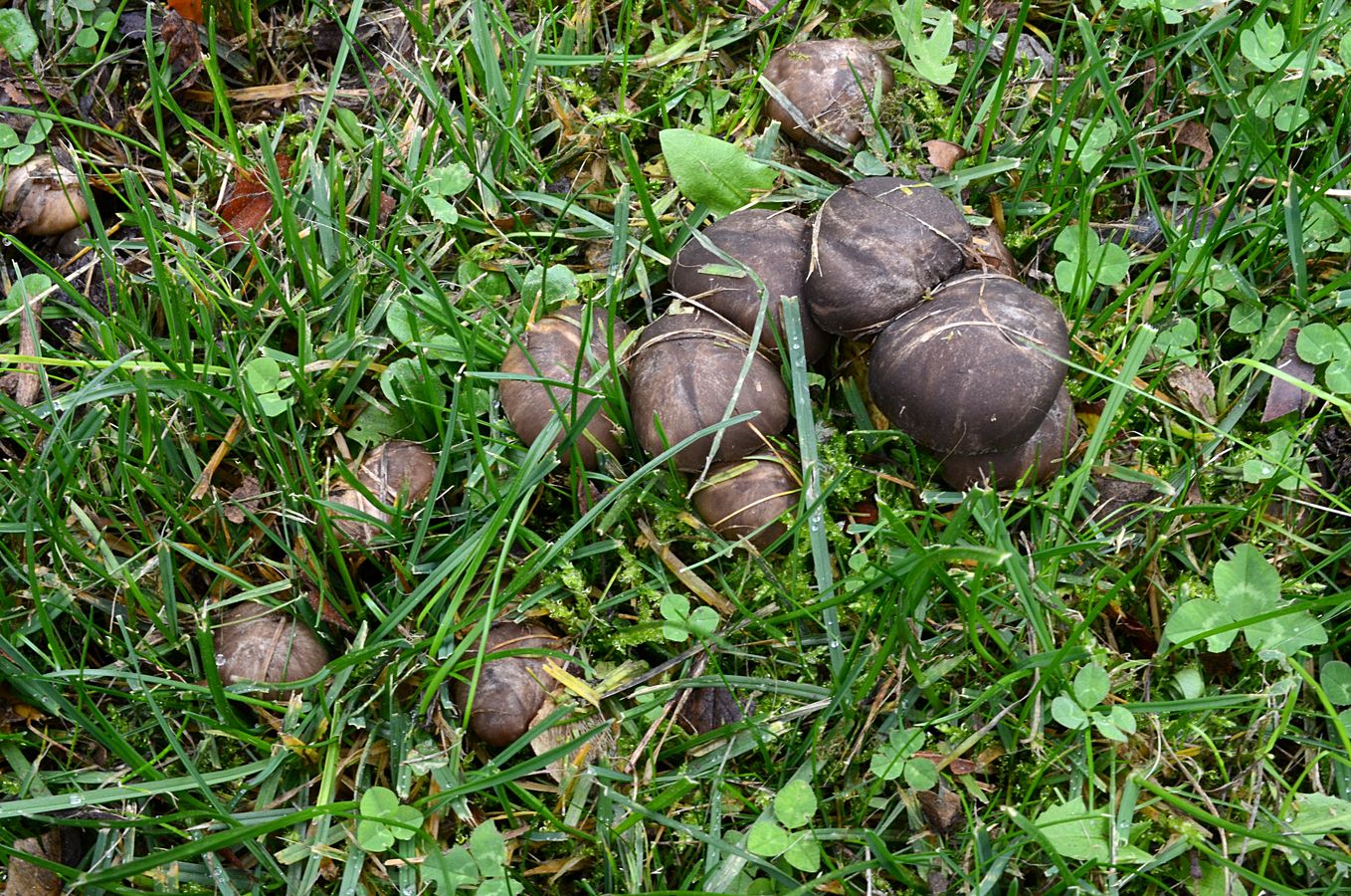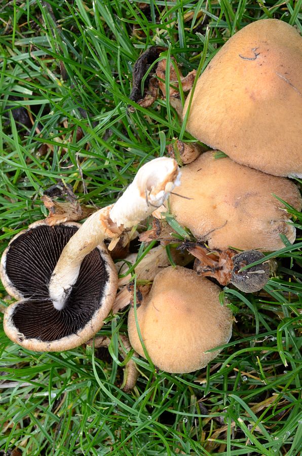 Wiese, Bild 2 sind allerdings junge Stockschwämmchen (Kuehneromyces mutabilis), die Weißflockigen Schüpplinge (Pholiota lubrica) sind die auf den beiden Bildern danach.
