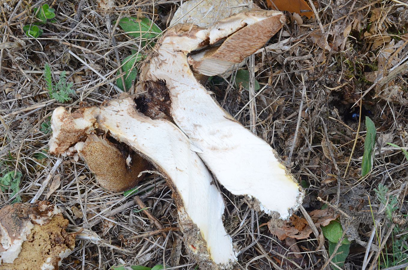 Trotzdem, Schnitt musste sein, und siehe: sehr sehr festes Fleisch immer noch, besonders in der unteren Stielhälfte,