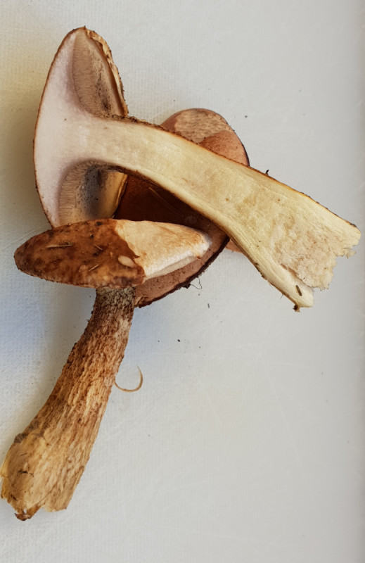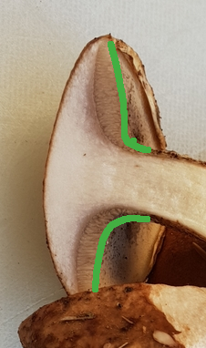 • Stimmt nun auch wieder! Wahrscheinlich hat mich dieses Detail intuitiv in Richtung Lärchenröhrling geschubst. Kein Raustielröhrling hat herablaufende Röhren, die bilden eigentlich immer einen "Burggraben".