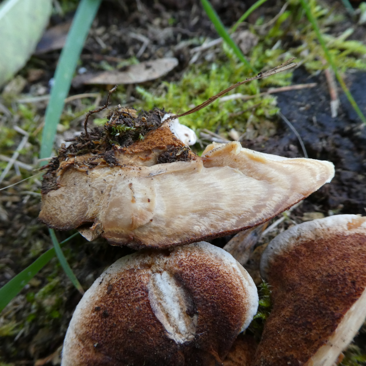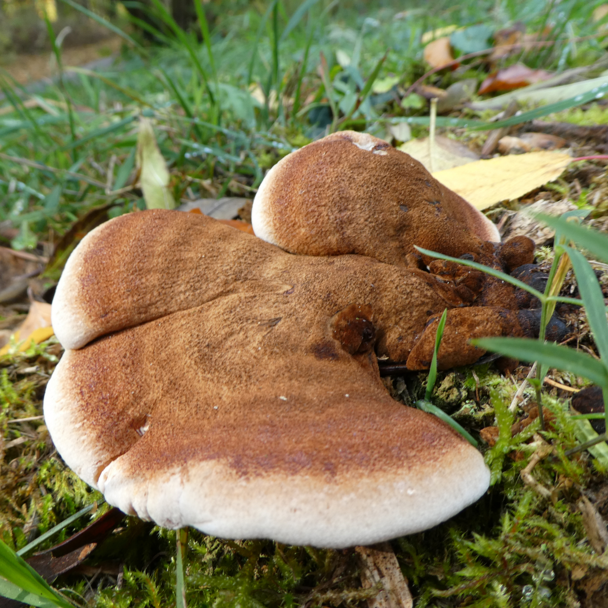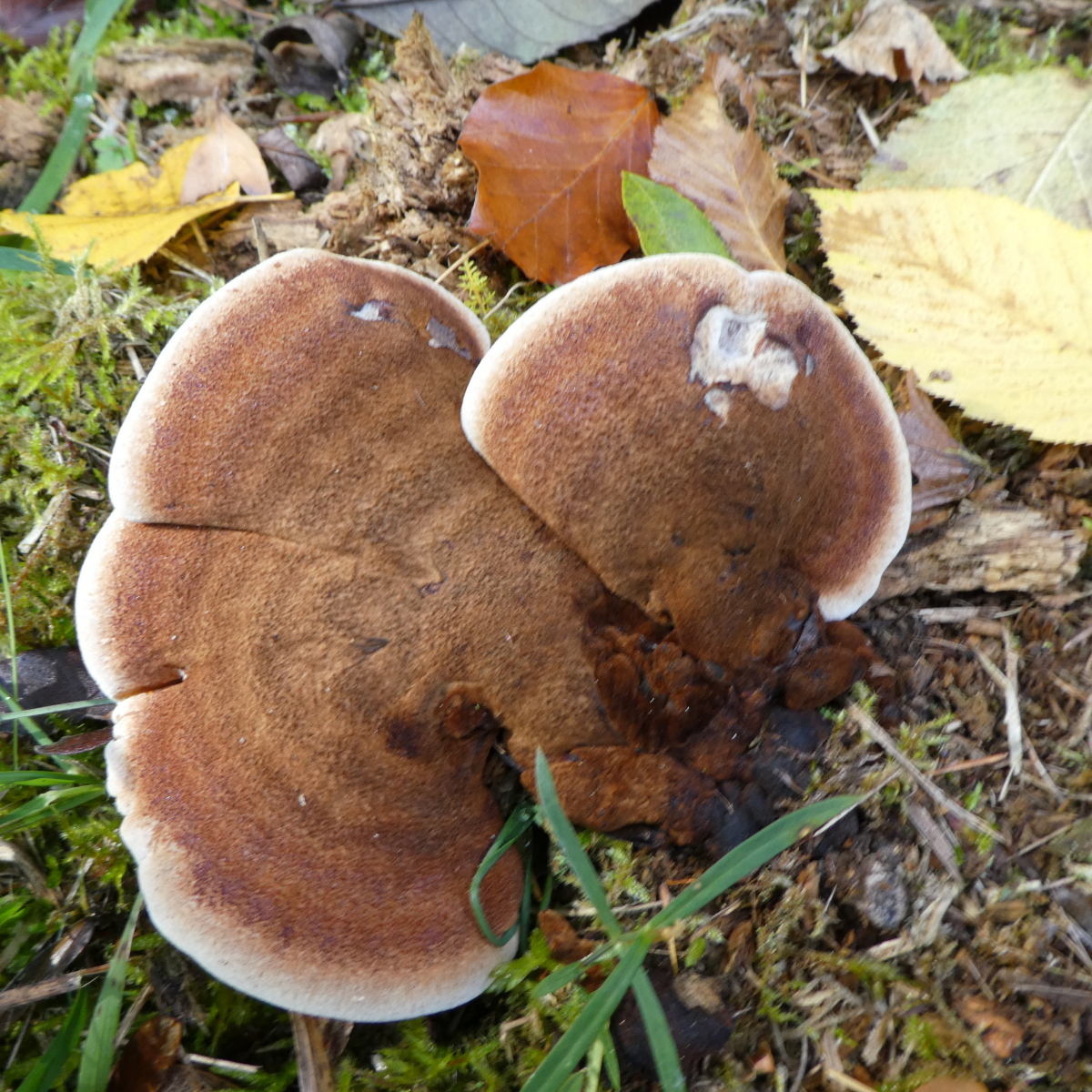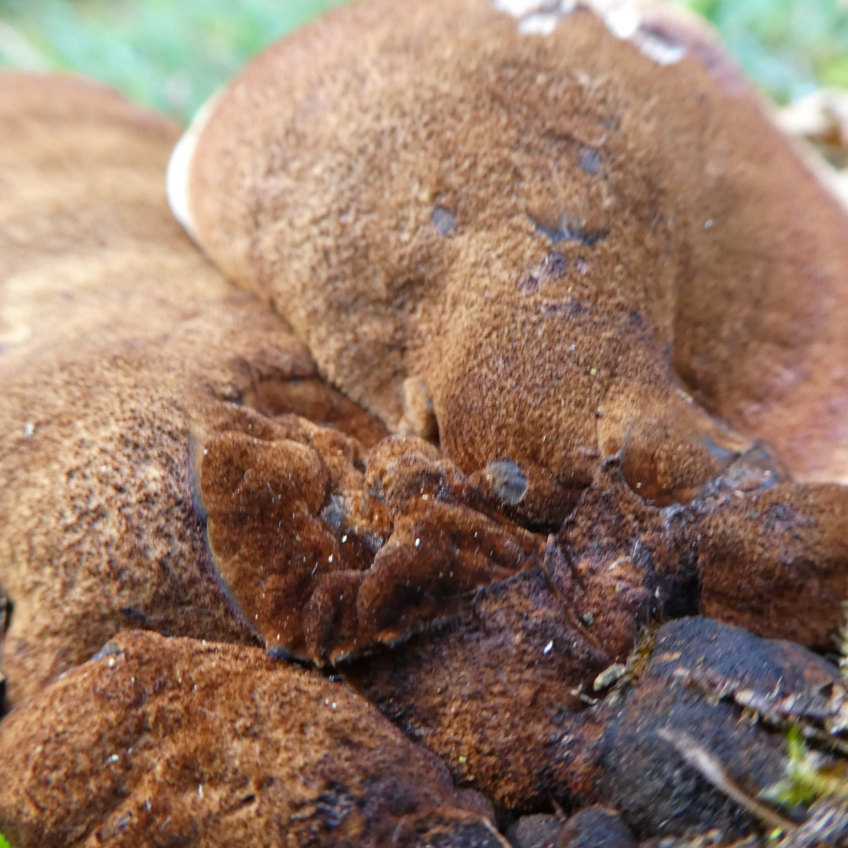 Die Fundortangaben: Hahnenkamm-Altmühltal, eine Wiese am Waldrand, auf der einen Seite Rotbuchenwald, auf der anderen Seite eine wildwachsende Hecke die in jungen Laubwald übergeht. Auf der Wiese selbst steht eine Kiefer und eine Lärche und eben ein dicker Baumstumpf der aber knapp über er Erde gefällt worden war, also keine Ahnung welcher Baum dies einmal war. An einen Geruch kann ich mich gerade nicht erinnern, ich könnte aber heute ein Stückchen des Pilzes holen. Aufgefallen ist mir, dass sich die Stelle an den Röhren die ich mit meinem Finger berührt hatte sofort leicht verfärbte.