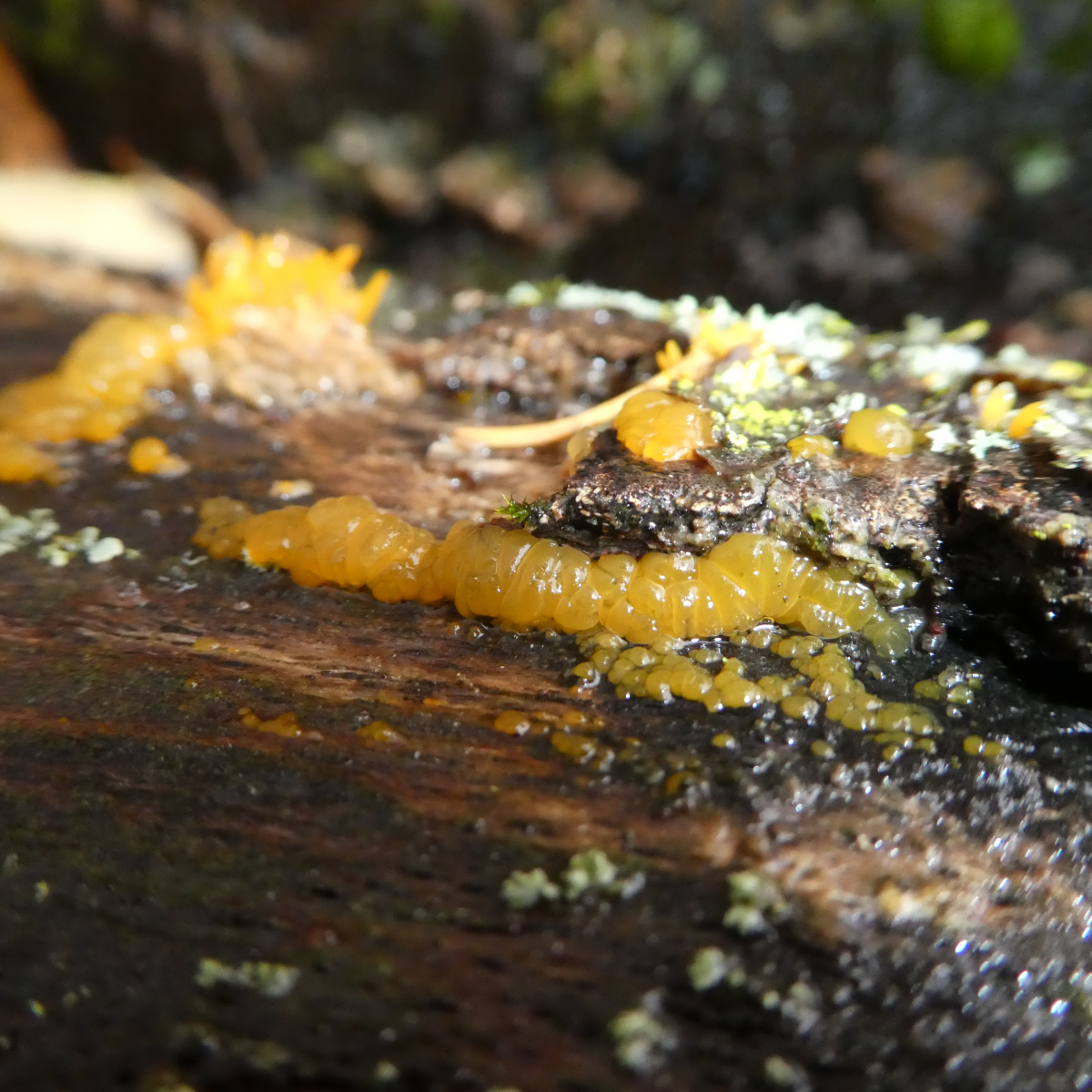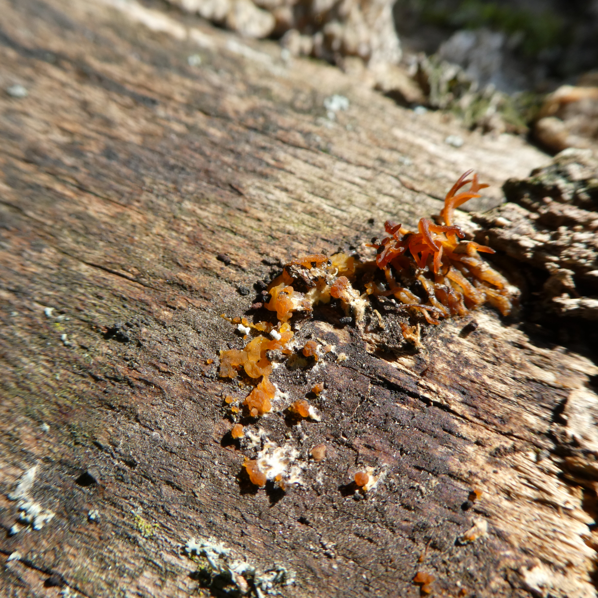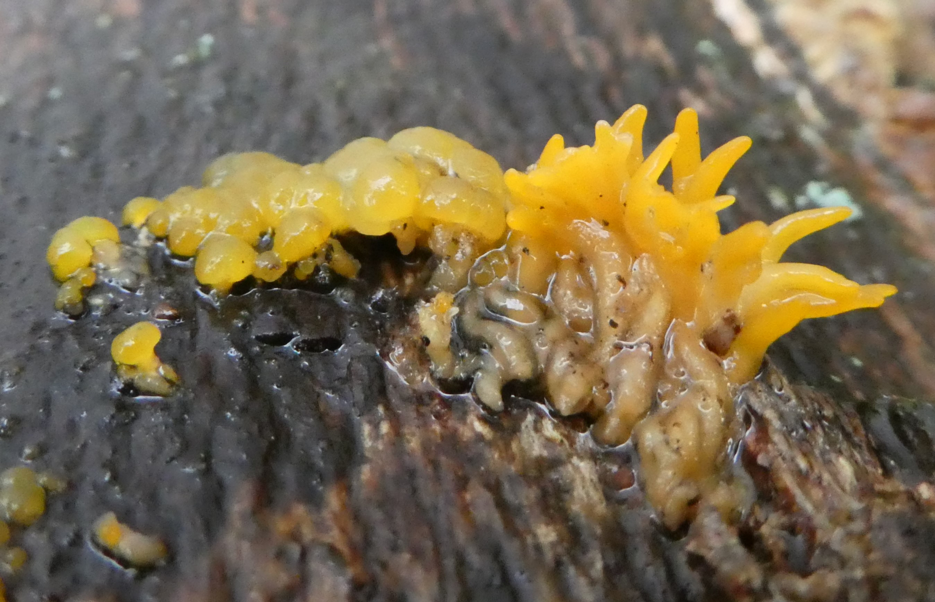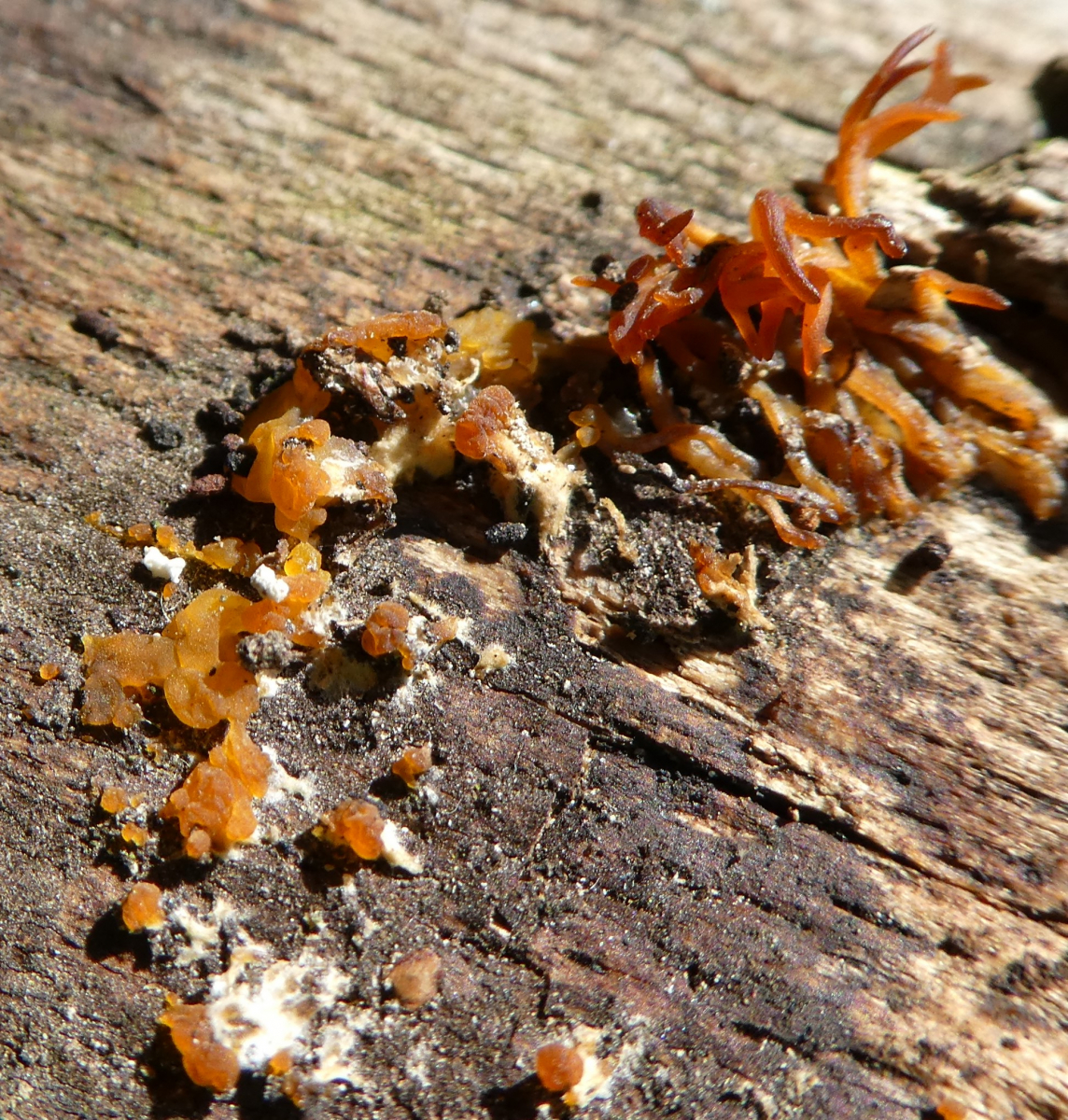 Also nach den neuen Bildern glaube ich, daß das schon zwei Arten sind, deren Fruchtkörper halt direkt nebeneinander wachsen. Links Gallertträne (Dacrymyces spec.), rechts Laubholzhörnling (Calocera cornea).