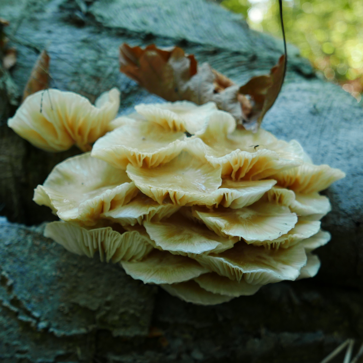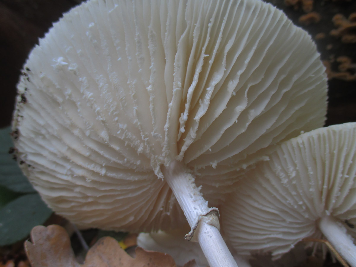 Dachte erst, dass es altersbedingte Auflösungserscheinungen incl. den Resten tierischer Aktivität. Aber man sieht ja, wenn man den scharfen Blick bemüht, dass das eher auf den Lamellen aufgesetzt ist.