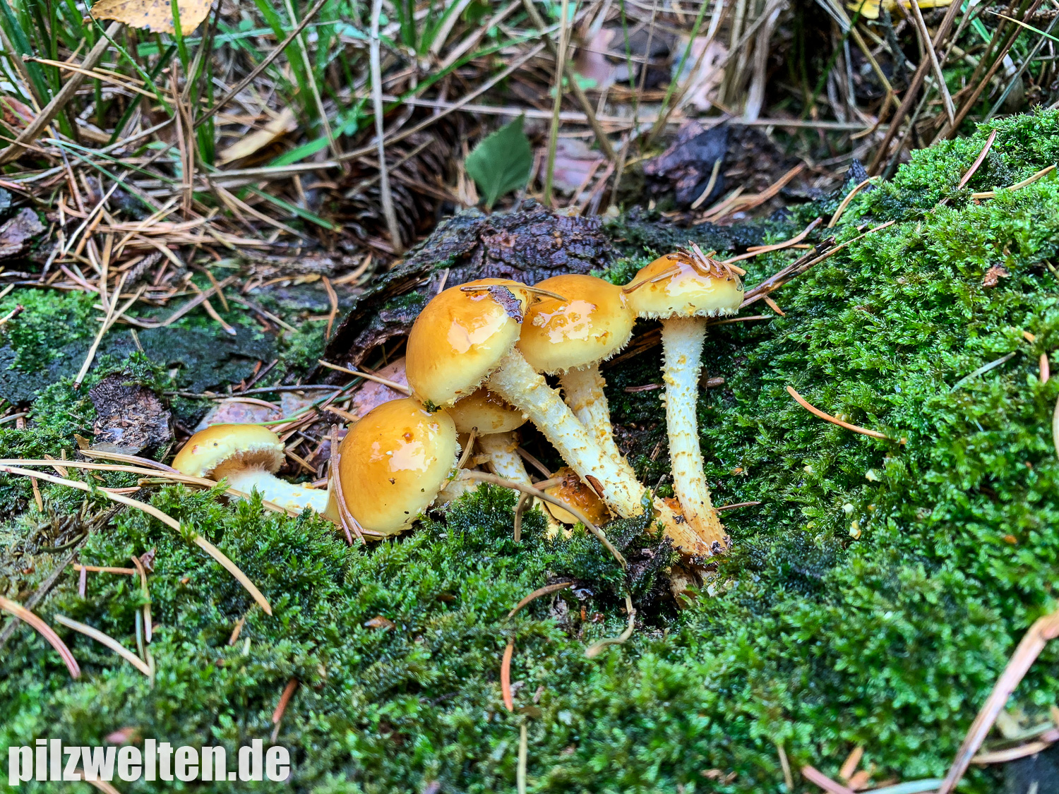 Gefunden haben wir diese prächtig goldig glänzenden Schüpplinge an der Wurzel einer Kiefer. Wir dachten aus der Entfernung zuerst an Pholiota aurivella, aber der Standort schließt den Laubholzbewohner denke ich schon mal klar aus. Bliebe noch Pholiota limonella, aber die Huthaut war "wie eingefettet", weshalb wir nach einigen Nachforschungen schnell auf Pholiota lucifera gestoßen sind. Geruch unauffällig. Geschmack nicht probiert.