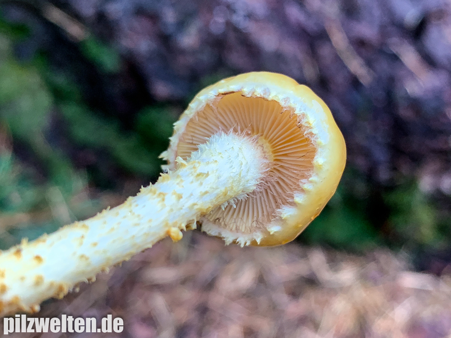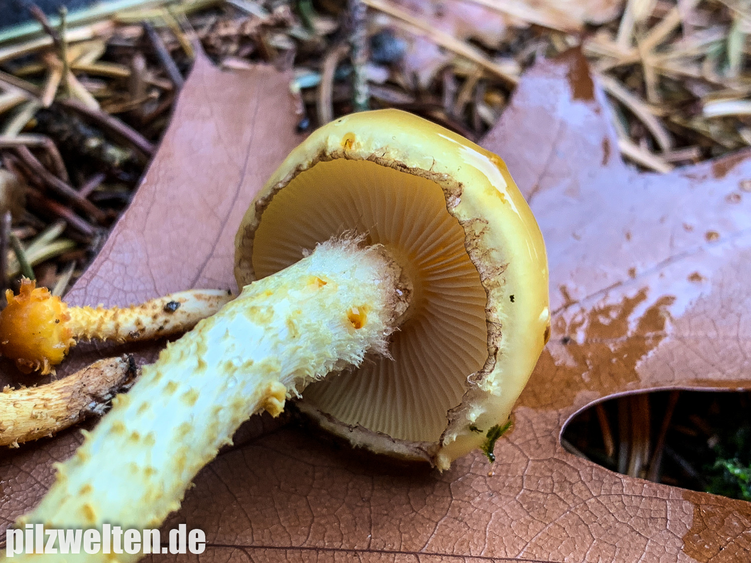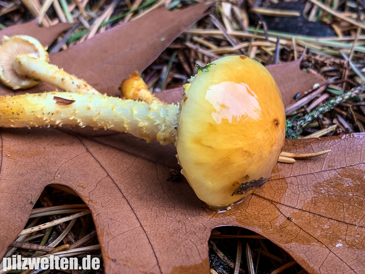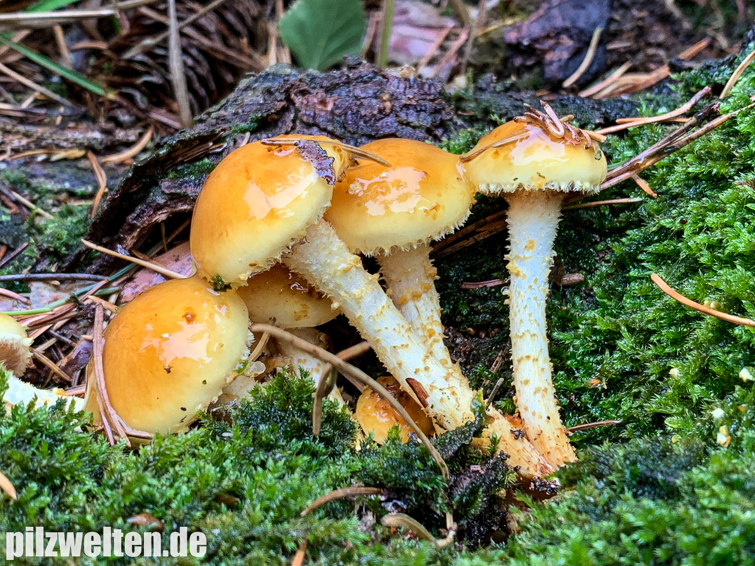 Das was hier beim unteren Pilz fast schon wie ein Regentropfen aussieht ist dicker Schleim. Alle Hüte waren mit dieser dicken Schleimschicht überzogen. Die Hutoberseite könnte man vielleicht sogar mit jungen Goldröhrlingen vergleichen, aber die Schleimschicht bei unseren Schüpplingen war hier deutlich dicker / ergiebiger.