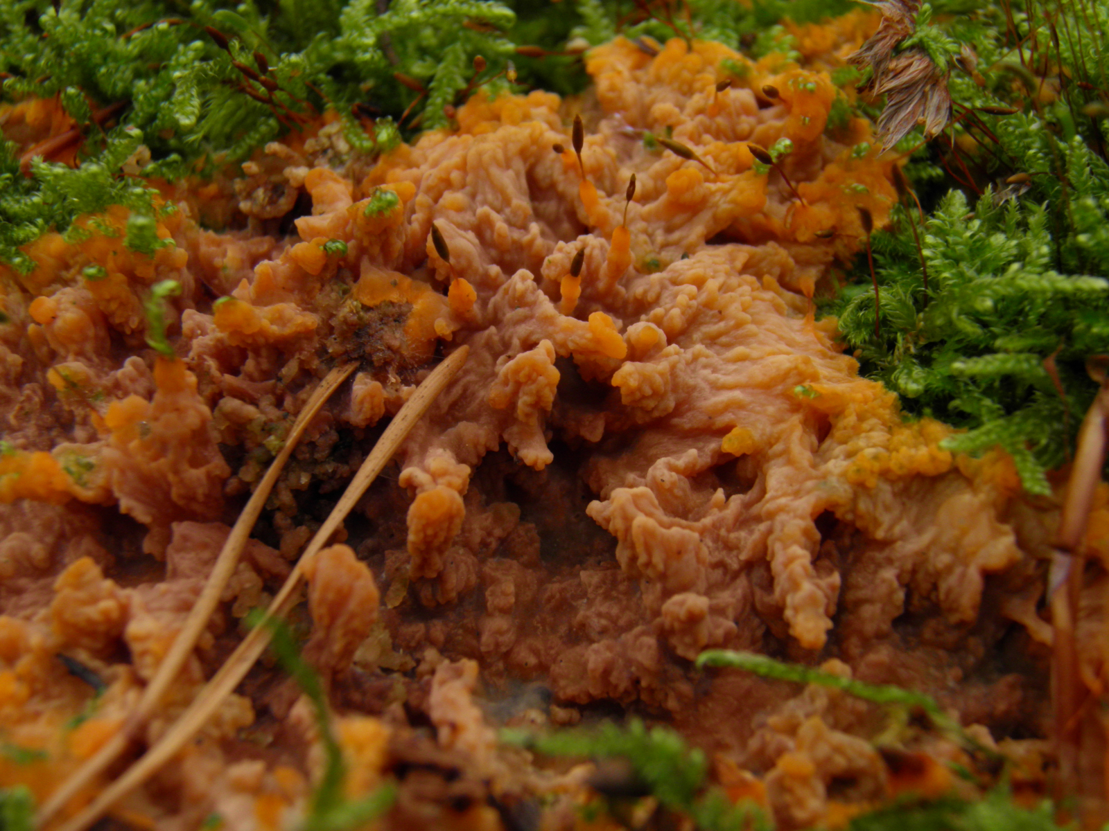 orange/weiß: vmtl duftender goldporling und reihige tramete im nachbarschaftsstreit