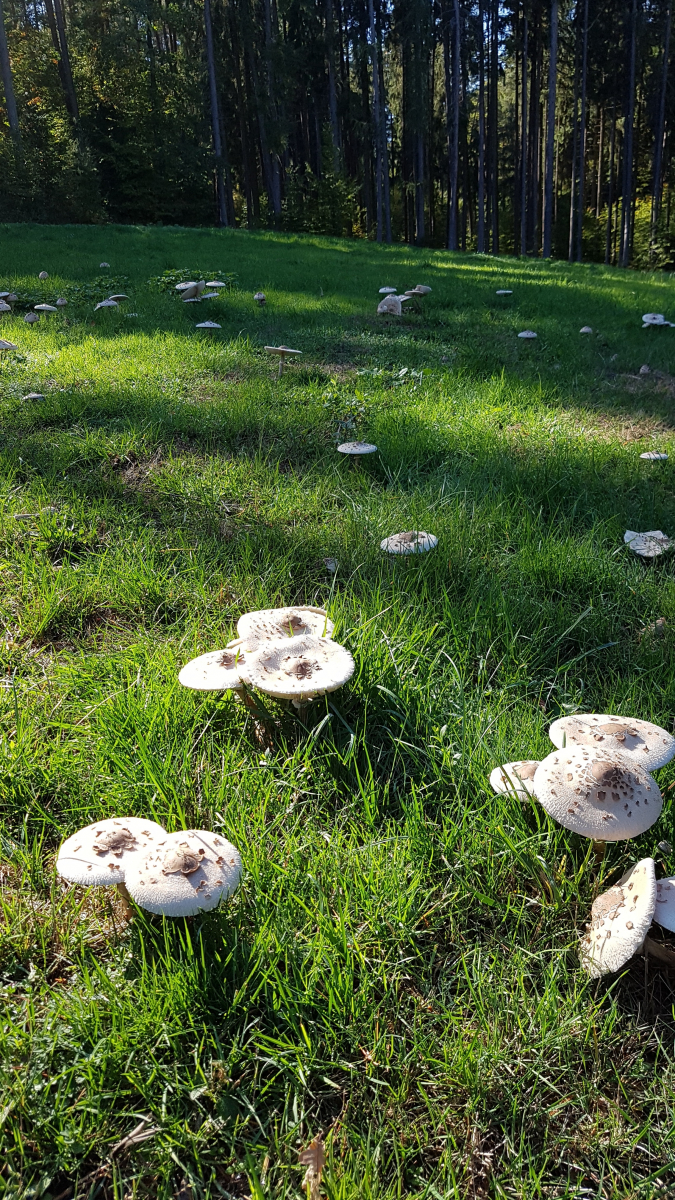 Der Hut hat ca einen Durchmesser von 10cm und riecht angenehm fruchtig. Er wächst auf einer großen Wiese zwischen Parasolen