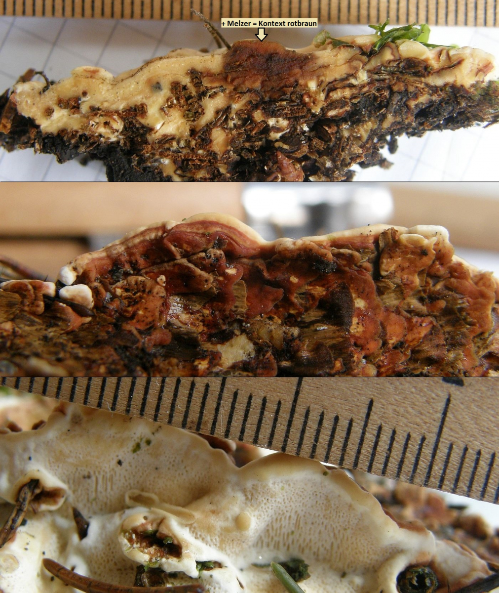 Und oft die von Antrodia xantha und einigen weiteren Antrodias, aber viel schwächer (da ist die Reaktion makrochemisch oft nicht sichtbar).