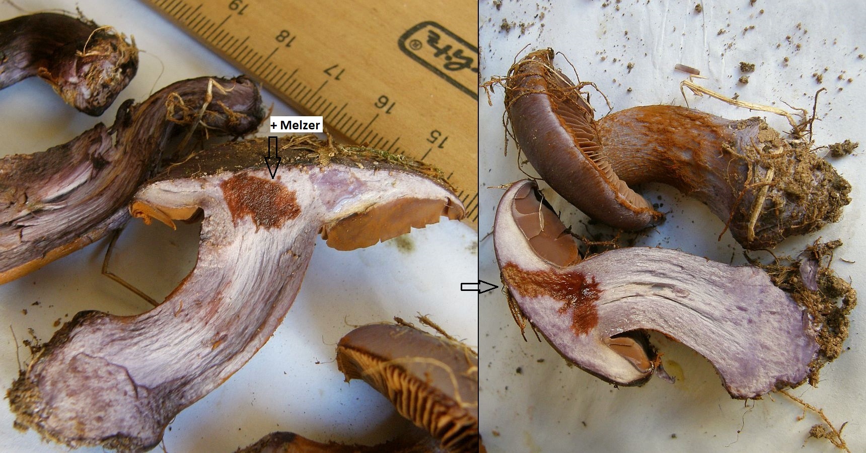 Es gibt Artengruppen, deren Hyphen an und in der Stielbasis reagieren amyloid, werden also blau, wenn man Melzer drauf tropft. Das ist nicht immer ideal zu sehen makroskopisch, und der Test muss an frischen Fruchtkörpern durchgeführt werden. Auch muss man darauf achten, nicht gleichzeitig mit dem Aufbringen der Reagenz Druck auszuüben. Weil auf Druck wird es ja auch blau.