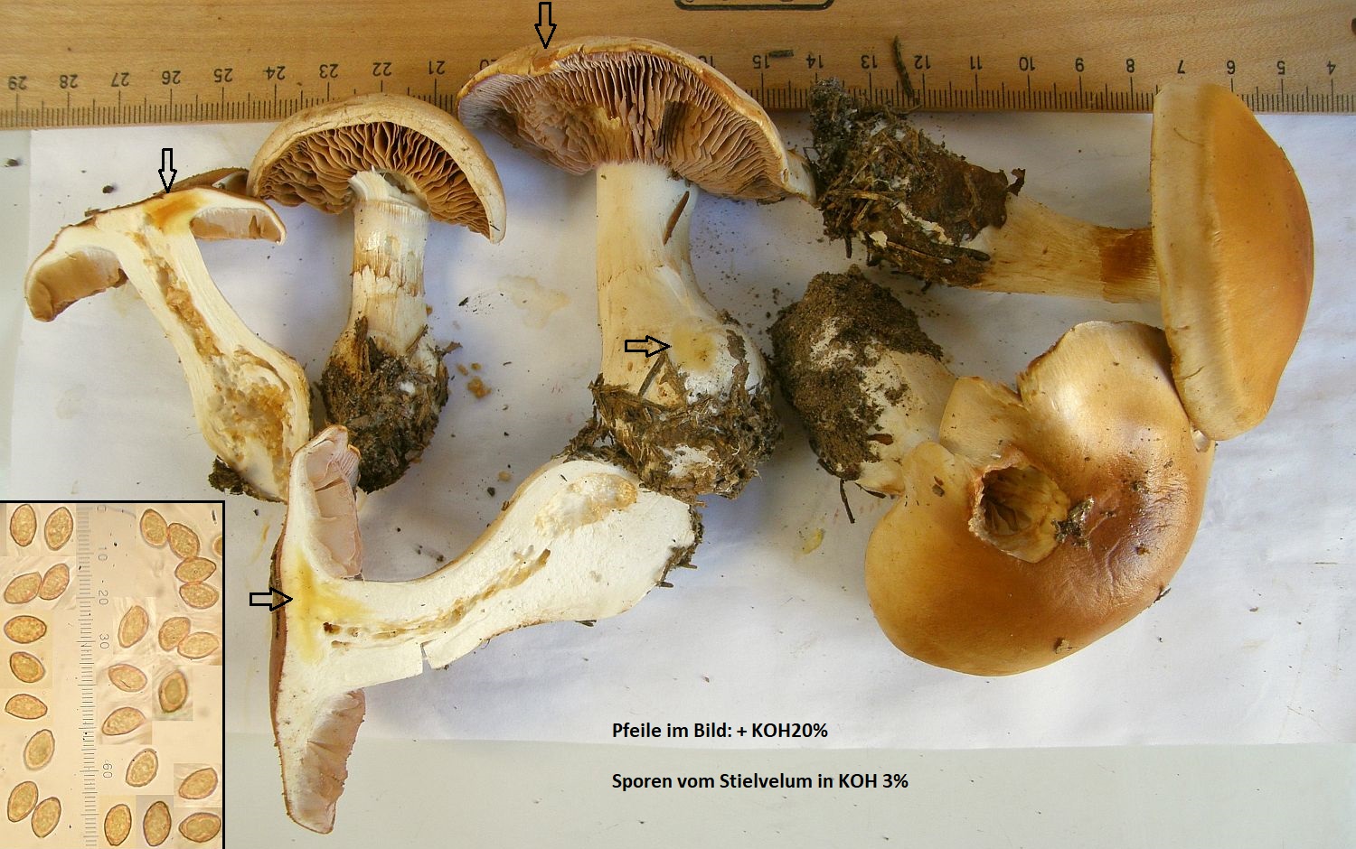 Für Cortinarius wäre dann aber KOH (mind. 20%) das meistgebrauchte Reagenz, das wird da an drei Stellen aufgetragen: Einmal auf die Huthaut am Hutrand, einmal auf die Trama (mache ich immer im Hutfleisch nahe Hut-Stiel-Übergang) und einmal außen am Rand der Stielbasis.