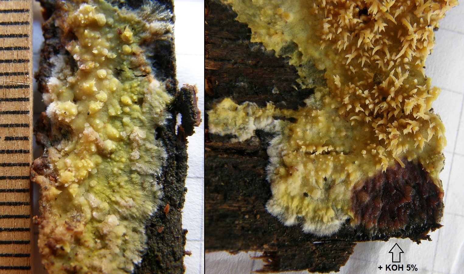 Bei Rindenpilzen nehme ich viel niedrigere Dosierungen, da reichen in der Regel 5%, um zu einer Reaktion zu kommen, wie hier bei Phlebia uda:
