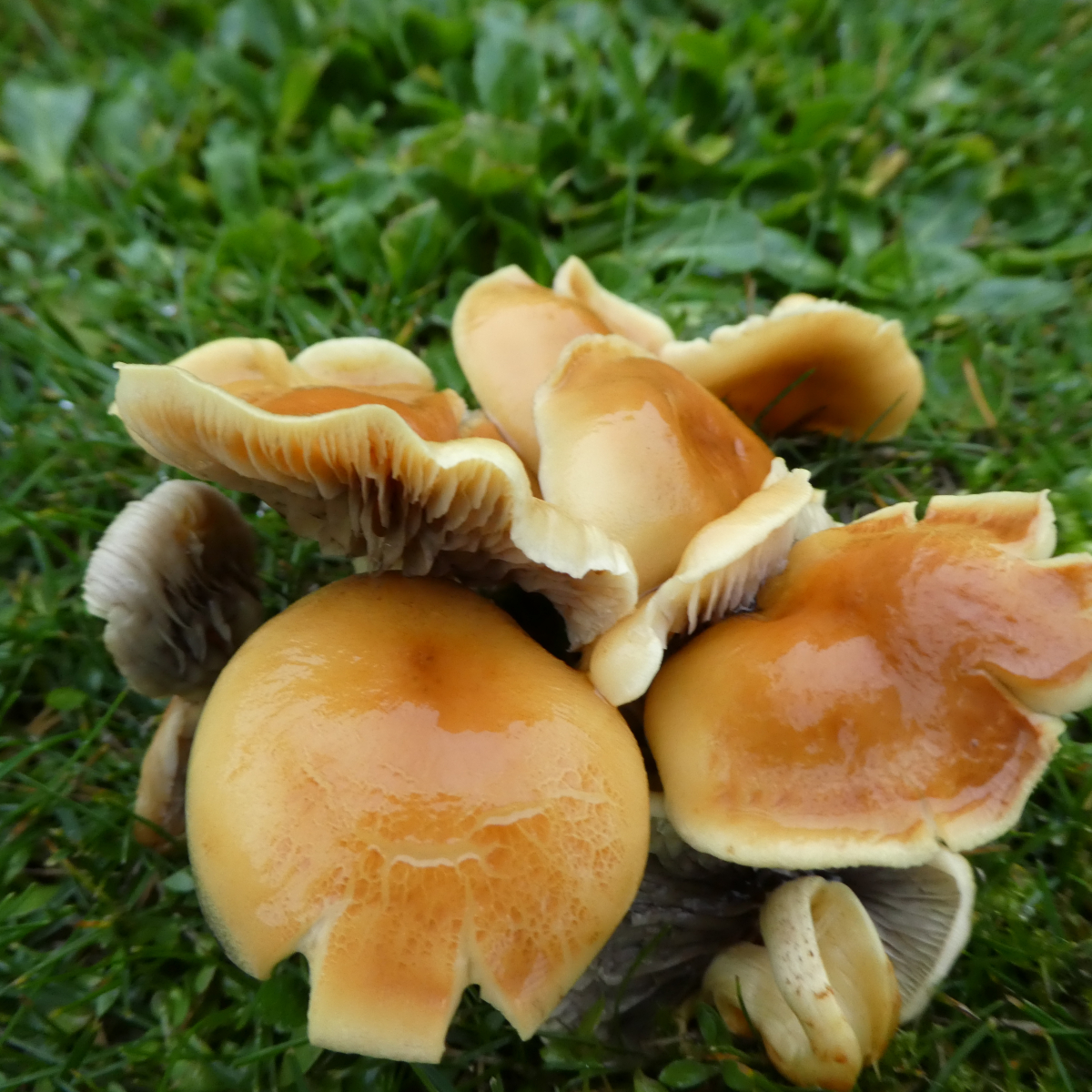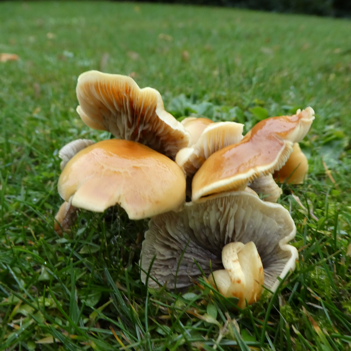 Dieses vergrabene Holz macht mich noch ganz verrückt. Mitten im schon ewig bestehenden Wohngebiet, weit und breit kein Baum, geschweige denn ein Nadelbaum, nur normale Hecken, und dann ist da ein Rasen dick voll mit diesen Pilzen. Und den Rauchblättrigen Schwefelkopf hatte ich mir vorhin als erstes angesehen aber mir dann wegen dem Holz und der Gesamtsituation gedacht, dass er dies eigentlich nicht sein kann - ich falle doch immer wieder auf dieses Holz herein!