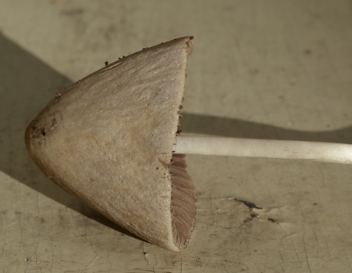 Hut bis 5 cm. Geruch und Geschmack unauffällig. Sporenpulver schwarz. Lamellenschneiden weißlich,
