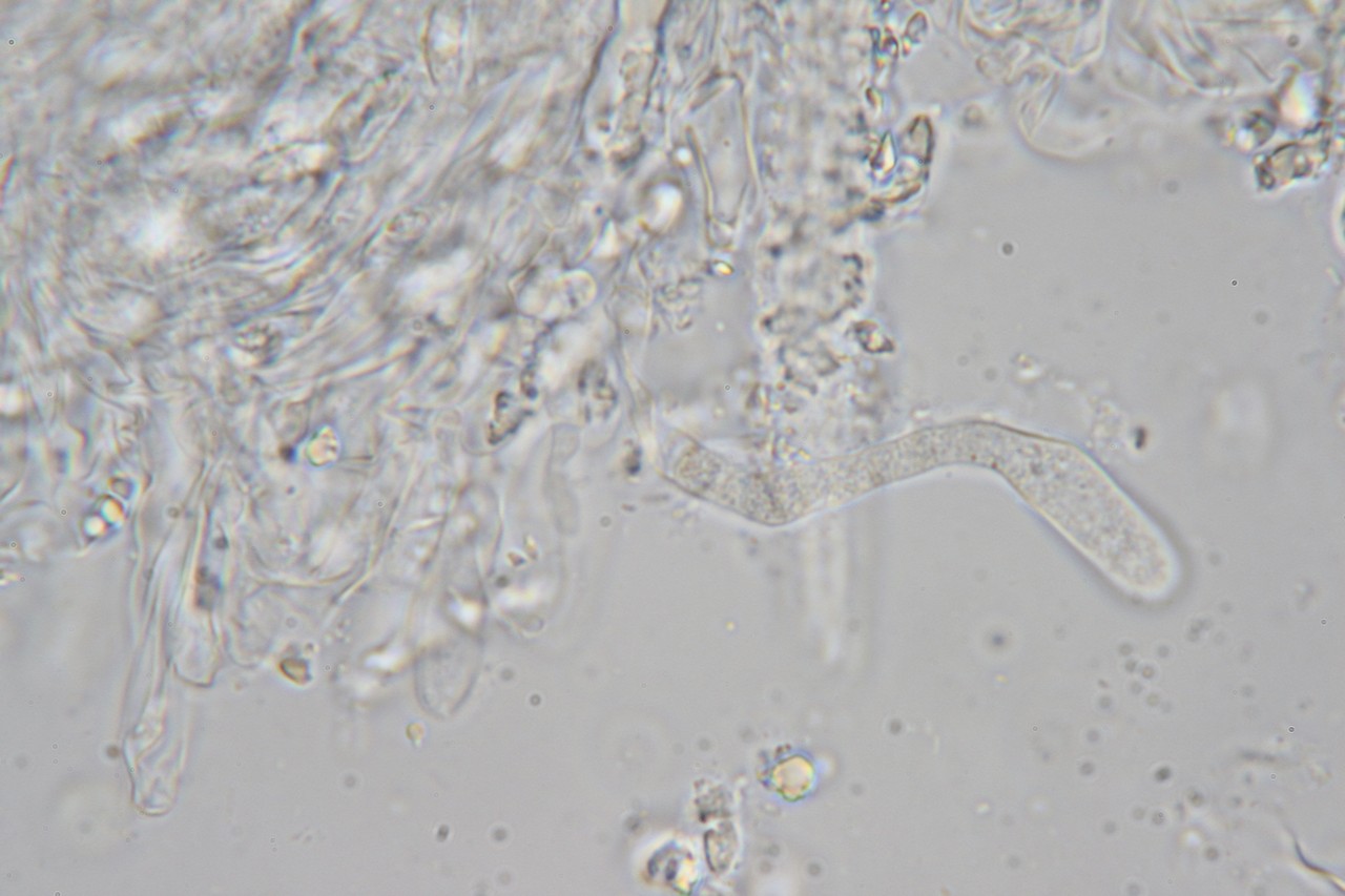Gloeozystiden (oder so aussehende Zystiden) zylindrisch, gebogen;