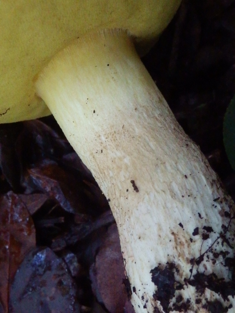 Stiel: ca. 16 cm, weißlich, gelb unter Hut, faserig, Netz nicht deutlich zu erkennen