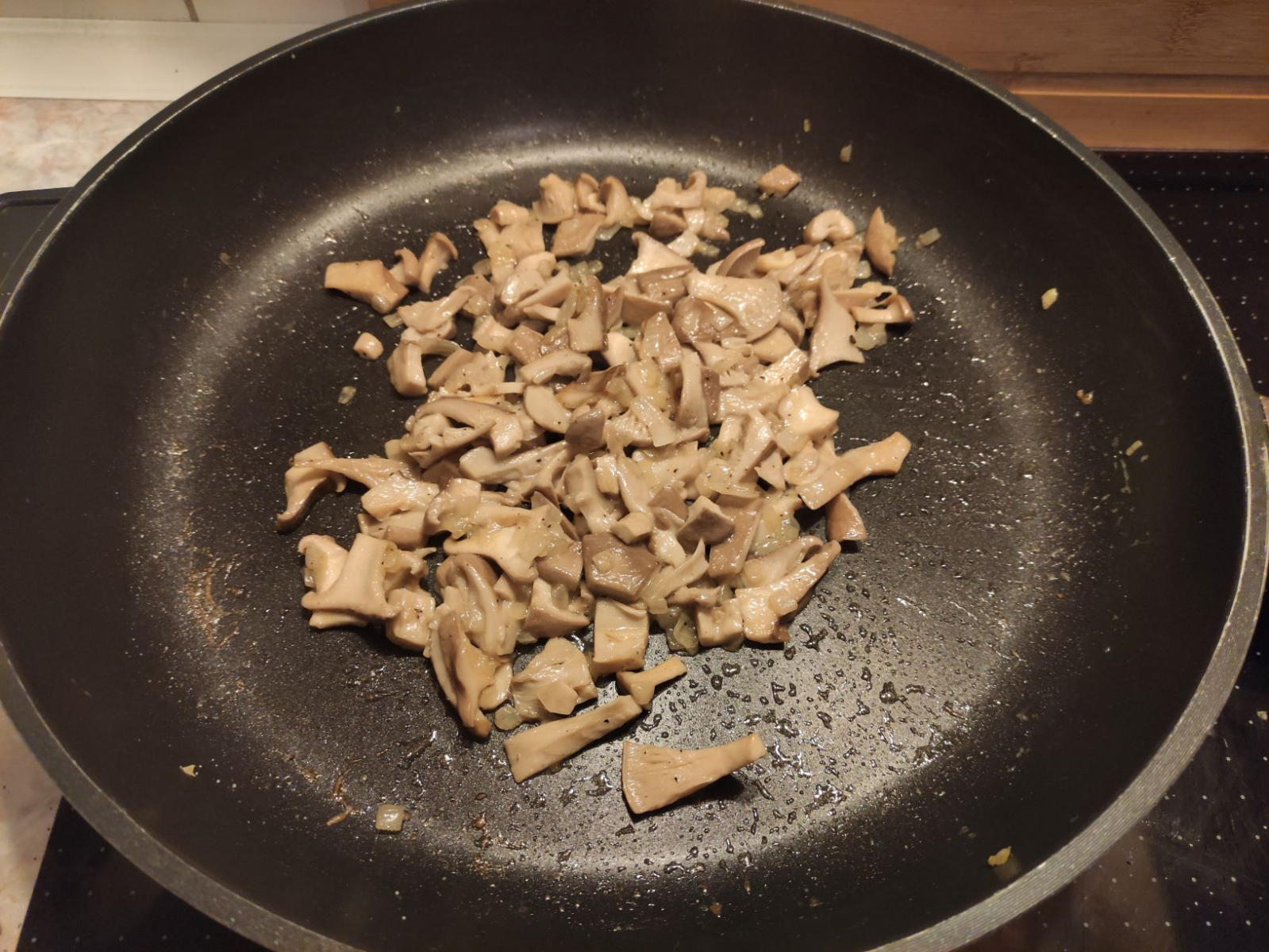 Das hier waren die Pilze. Von dem großen habe ich nur die Hutränder genommen. Bei den kleineren den oberen Stielteil mit dazu, bei den mittleren nur die Hüte.