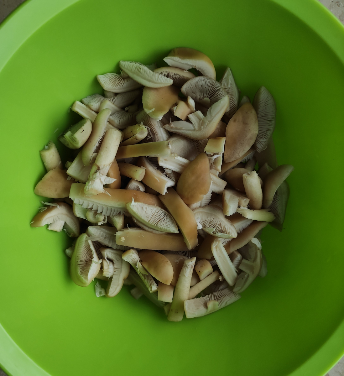 Ich habe mir heute den Voreilenden Ackerling (Agrocybe praecox agg.) mal mitgenommen, weil der hier in Massen steht. Es war die etwas dickere Version, die sich auf Rindenmulch dickfuttert, weil die schneller zu ernten waren als die dünnstieligen Gras-Varianten.