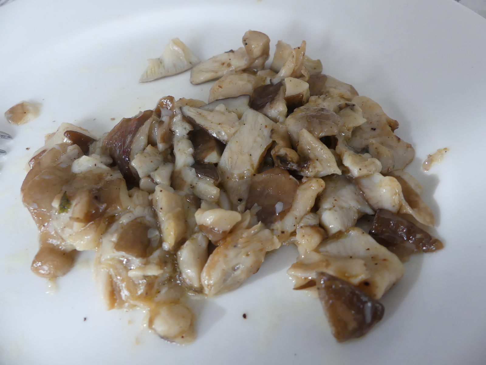 Heute ist Tag der Einzelverkostungen! Angefangen haben wir (meine bessere Hälfte und ich) mit dem Mehl-Räsling, der sich leider wie ein Schwamm mit dem Regenwasser vollgesogen hat. Fundort war eine Waldwiese im hohen Gras, die war klatschnass. Die (recht weichfleischigen) Hüte sonderten das Wasser schon beim Zerschneiden ab, dementsprechend war das eher ein Kochen als Braten in der Bratpfanne und das Ergebnis für unseren Geschmack etwas zu weich in der Konsistenz: