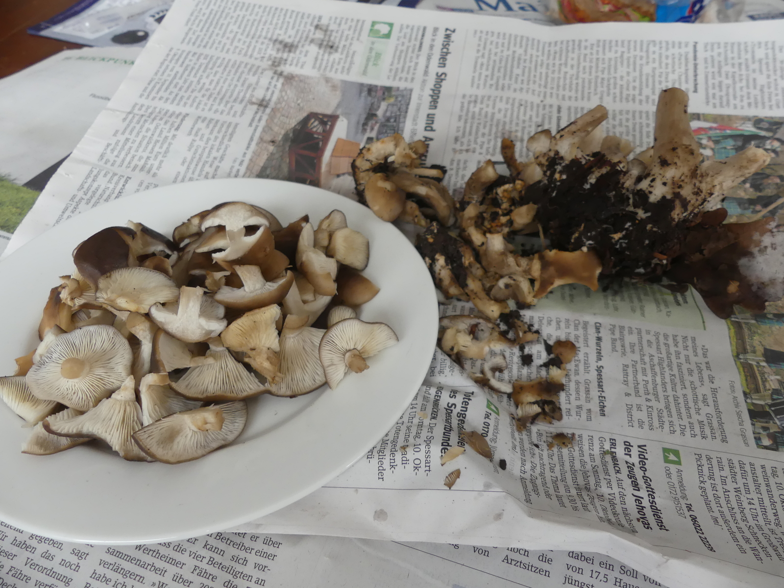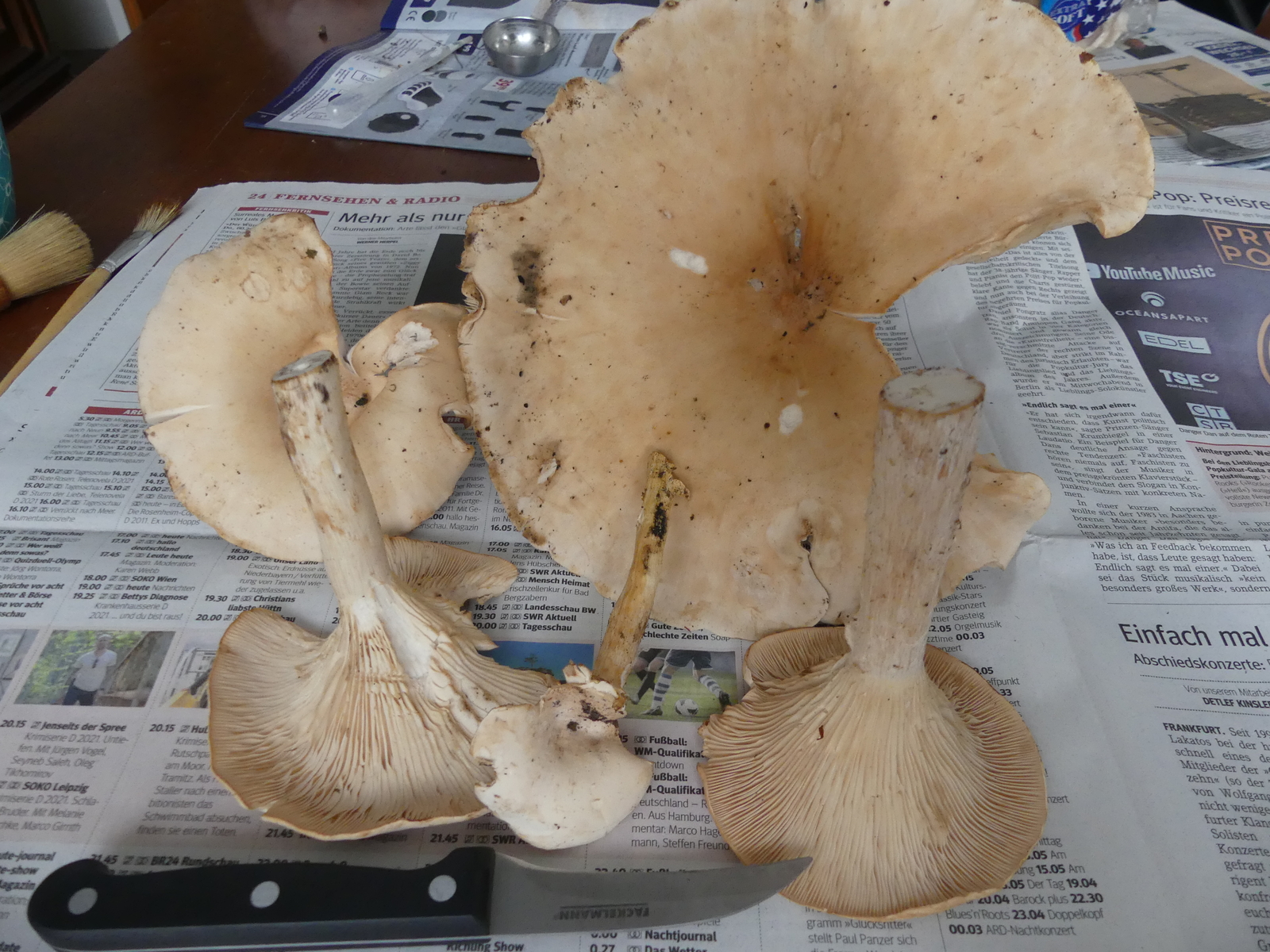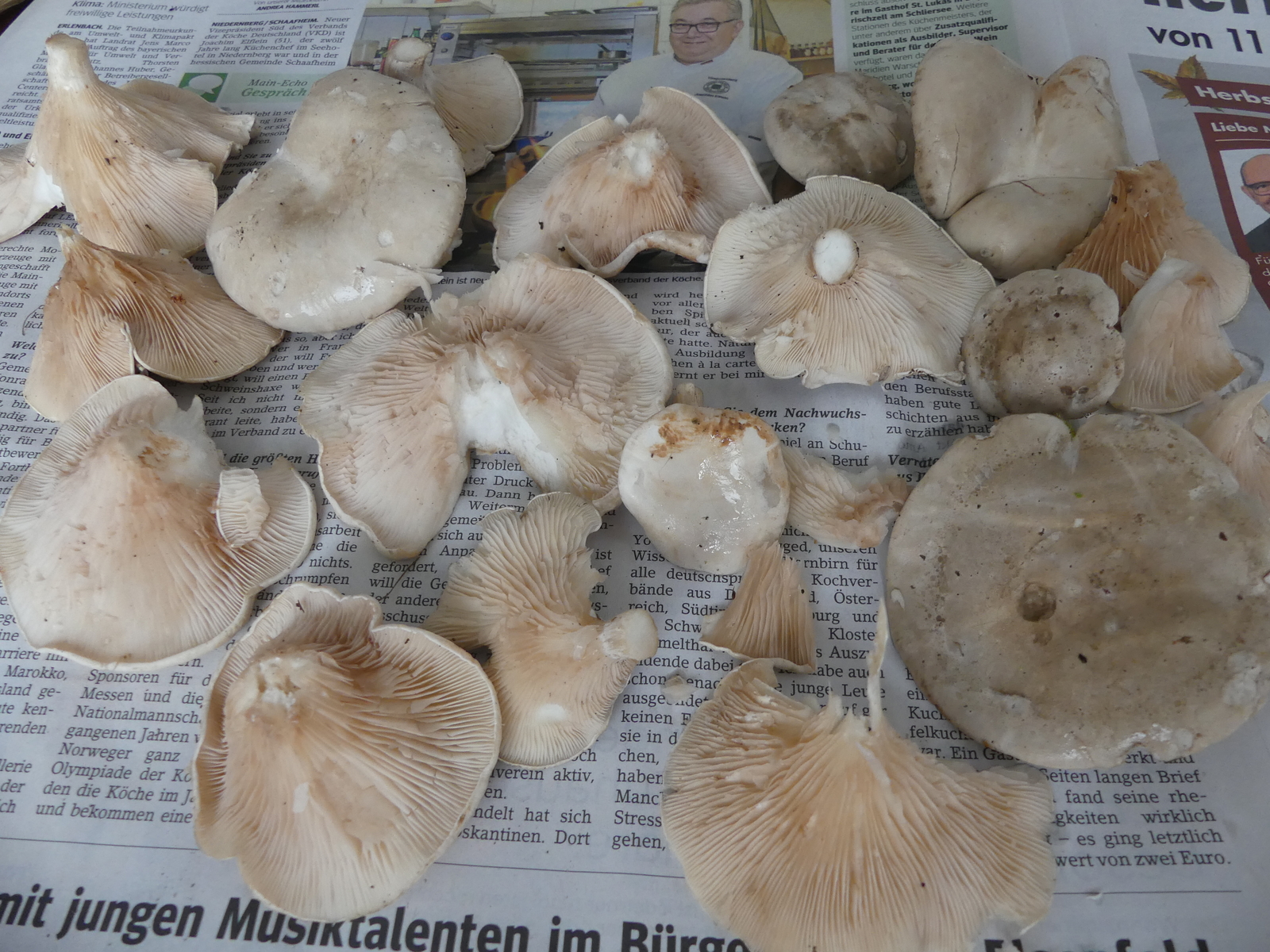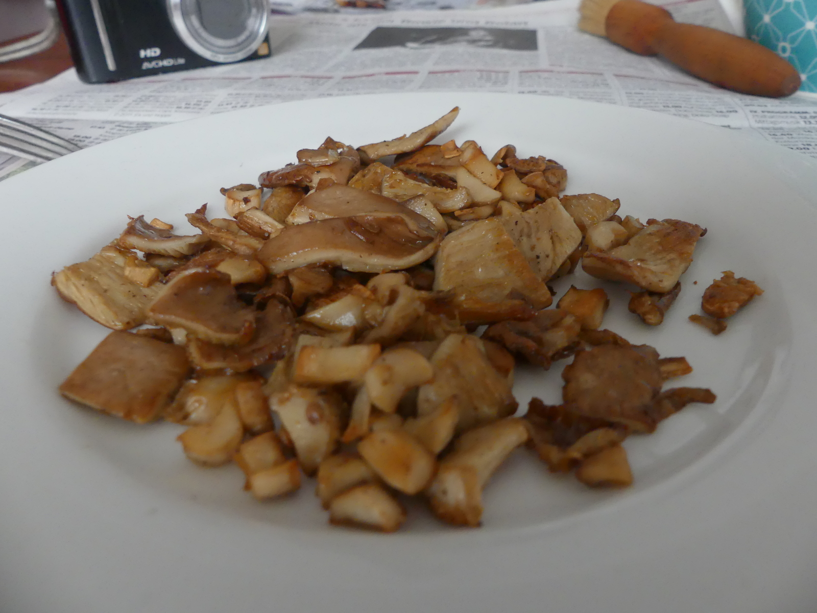 Zweiter Kandidat war ein weißer Schneckling. Im Wald hatte ich noch auf Elfenbeinschnecklinge gehofft, aber beim Erhitzen war der Geruch dann doch eher Richtung Essig als Zitrusfrüchte. Fertig zubereitet war das weitestgehend verflogen, und er schmeckt auch nicht säuerlich. Aufgrund der ungewöhnlichen Zubereitung (gesüßt statt gesalzen) traue ich mir dazu aber noch keine Bewertung zu.