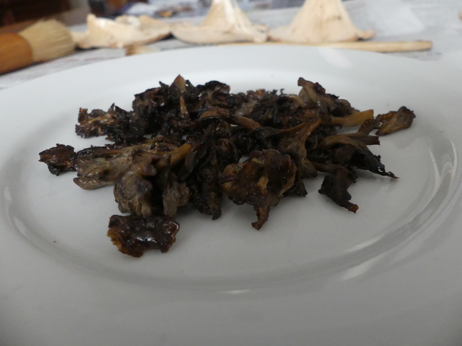 Roh riecht der etwas aufdringlich bittermandelartig, das verflüchtigt sich aber alsbald in der Bratpfanne. Festfleischig, nimmt nicht so viel Wasser auf, entwickelt bei scharfem Anbraten wunderbare Röstaromen, eindeutig besser als die Krause Kraterelle. Wir vergeben 9/10 Punkten, Tagessieger.