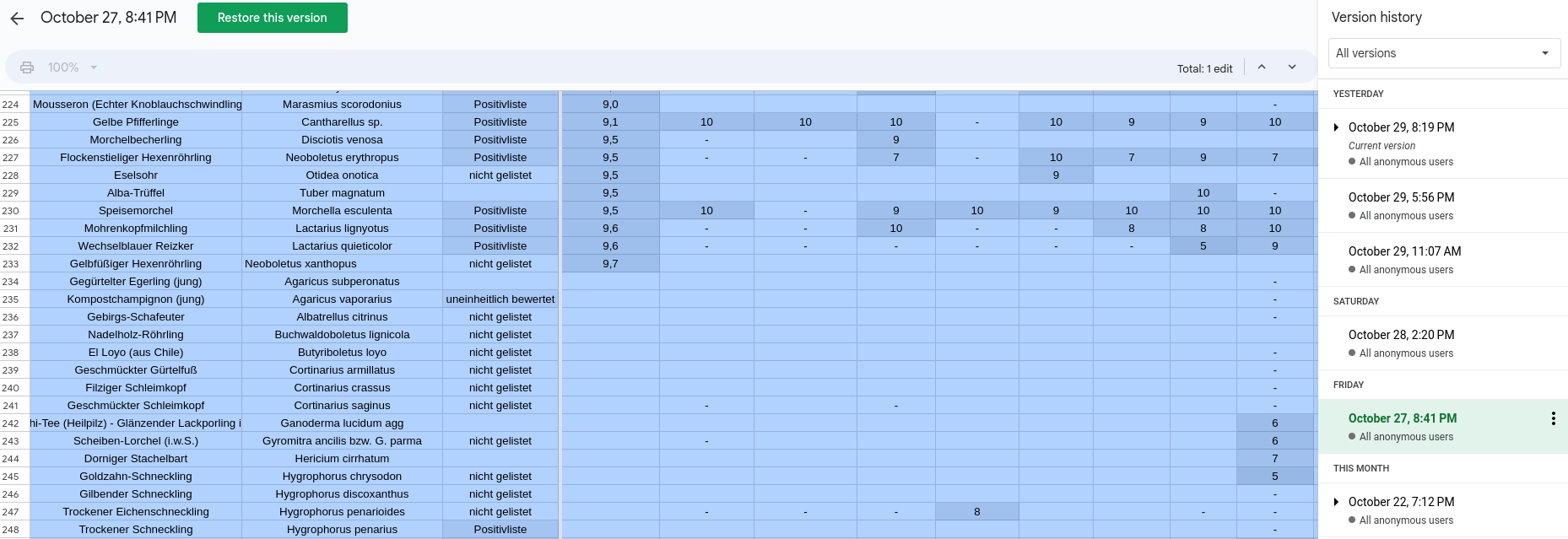 Grundsätzlich, wenn die Tabelle zerschossen aussieht, bitte keine Änderungen machen, sondern gleich korrigieren. Das muss nicht unbedingt ich tun, dass kann jeder wer ein Google-Konto hat. Das geht zum Beispiel folgendermaßen:
