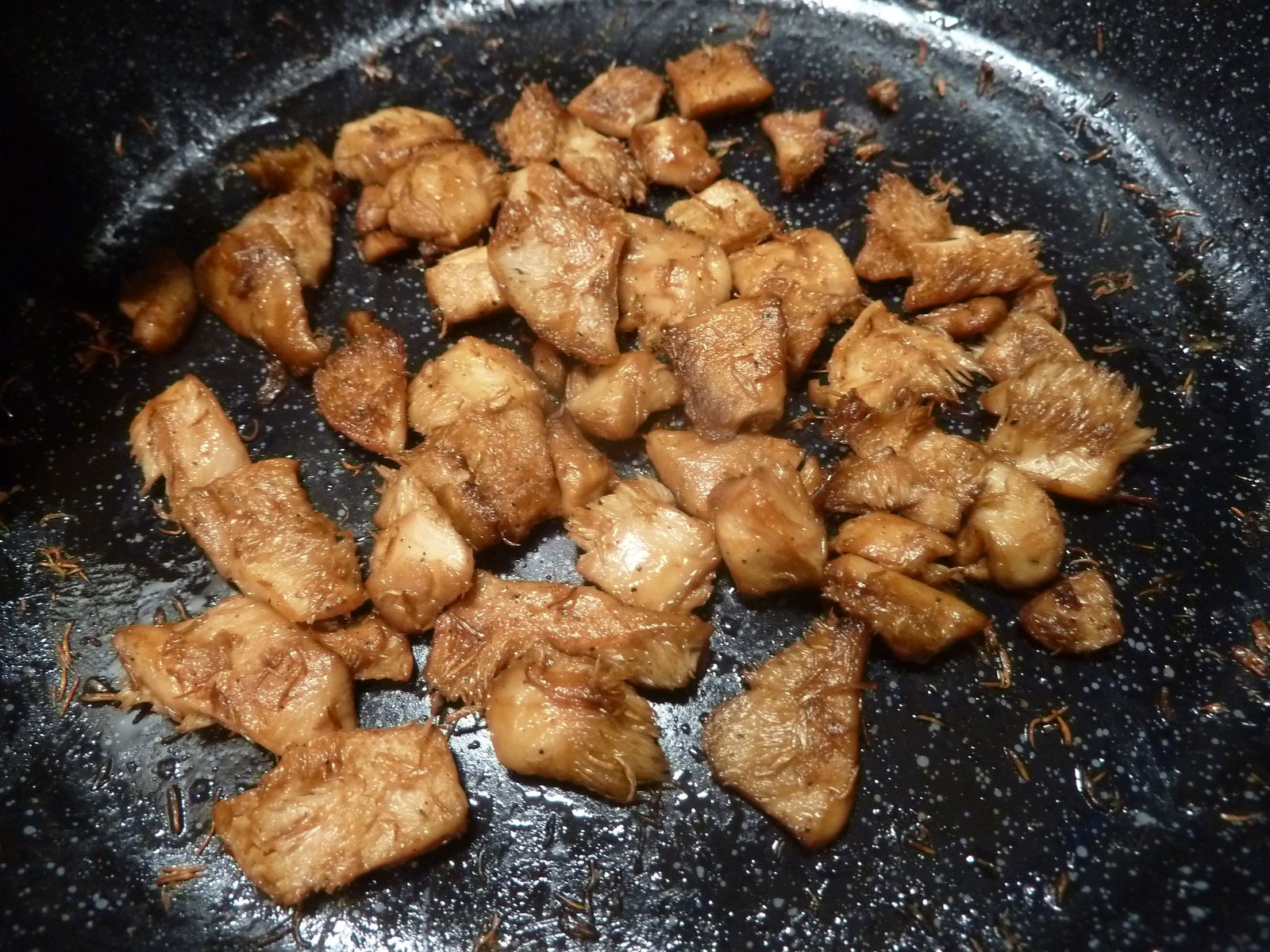 Die beiden Exemplare wurden bis auf den Stiel und jeweils etwas Hut- und Stachelfleisch (Rückstellprobe für alle Eventualitäten ...) in der Bratpfanne zunächst im eigenen Saft erhitzt, bis die - witterungsbedingt - reichlich austretende Flüssigkeit weitgehend verdampft war. Anschließend noch einen Teelöffel Olivenöl dazu und ein paar Minuten auf mittlerer Stufe weiter erhitzt. Zum Schluss eine Prise Salz und Pfeffer - fertig.