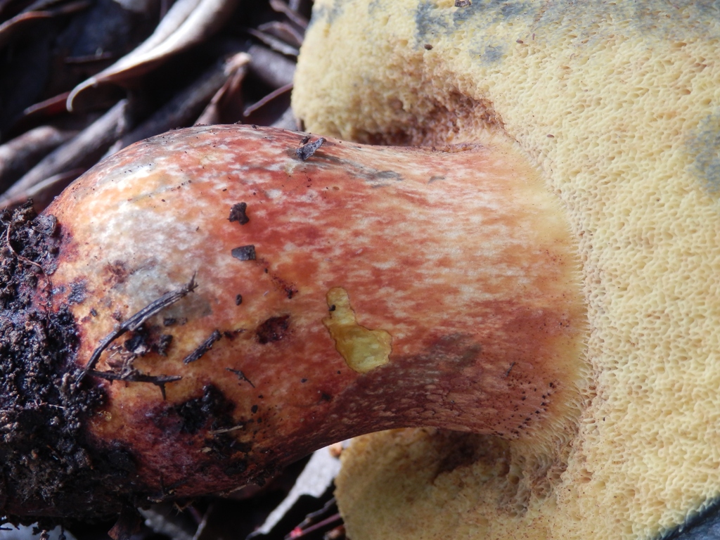 Die Beispiele von Xerocomus dryophyllus, die ich im Netz finde sind kleiner und haben einen dünnen, unten verdünnten Stiel, wogegen mein Pilz doch sehr wuchtig ist mit einem keulenförmigen Stiel, der unten deutlich verdickt ist. Auch scheinen mir die Röhren bei meinem Pilz feiner als beim Xerocomus dryophyllus.
