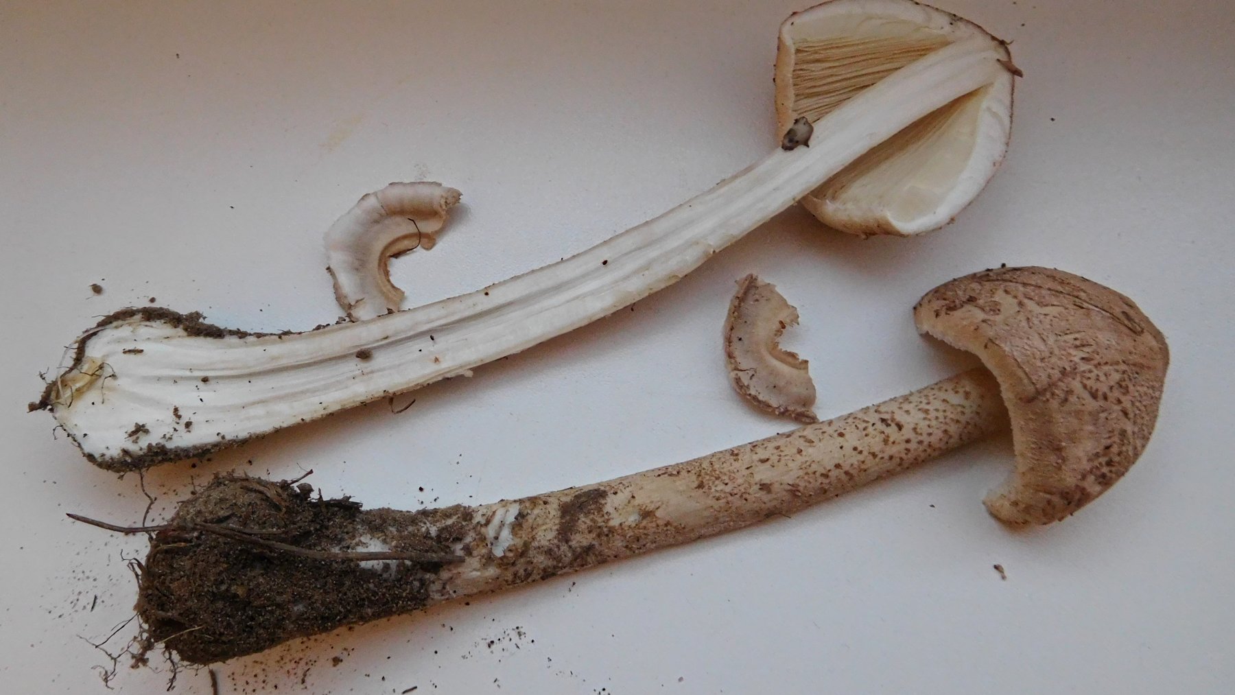 Riesenschirmlinge machen sich die letzten Jahre rar. Heute habe ich ein paar Kleinere gefunden. Die Art kenne ich nicht. Nun ist die Frage, liegt es an der Jahreszeit, daß die Hüte nicht größer als 10 cm Durchmesser haben, oder liegt es an der Art? Gefunden auf einer Wiese mit einzelnen Kiefern und sandigem Boden. Nun gibt es ja noch Zitzenschirmlinge, Ackerschirmlinge und mehr.
