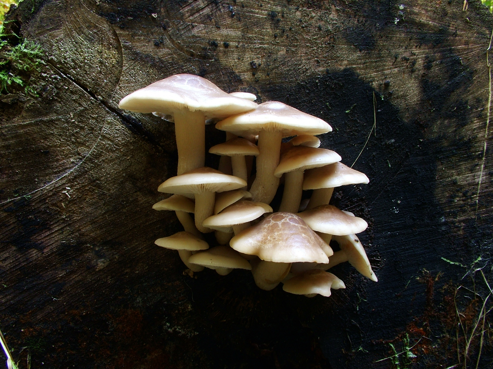 Ich hätte da noch den Gedanken, daß da Holz im Boden ist, und diese Pilze Hypsizygus tessulatus (Buchenrasling) sein könnten. Wären allerdings ganz schöne Brummer, aber solche "Kulturarten" sehen in freier Wildbahn schon gerne mal anders aus als im gut sortierten Gemüsefachhandel.