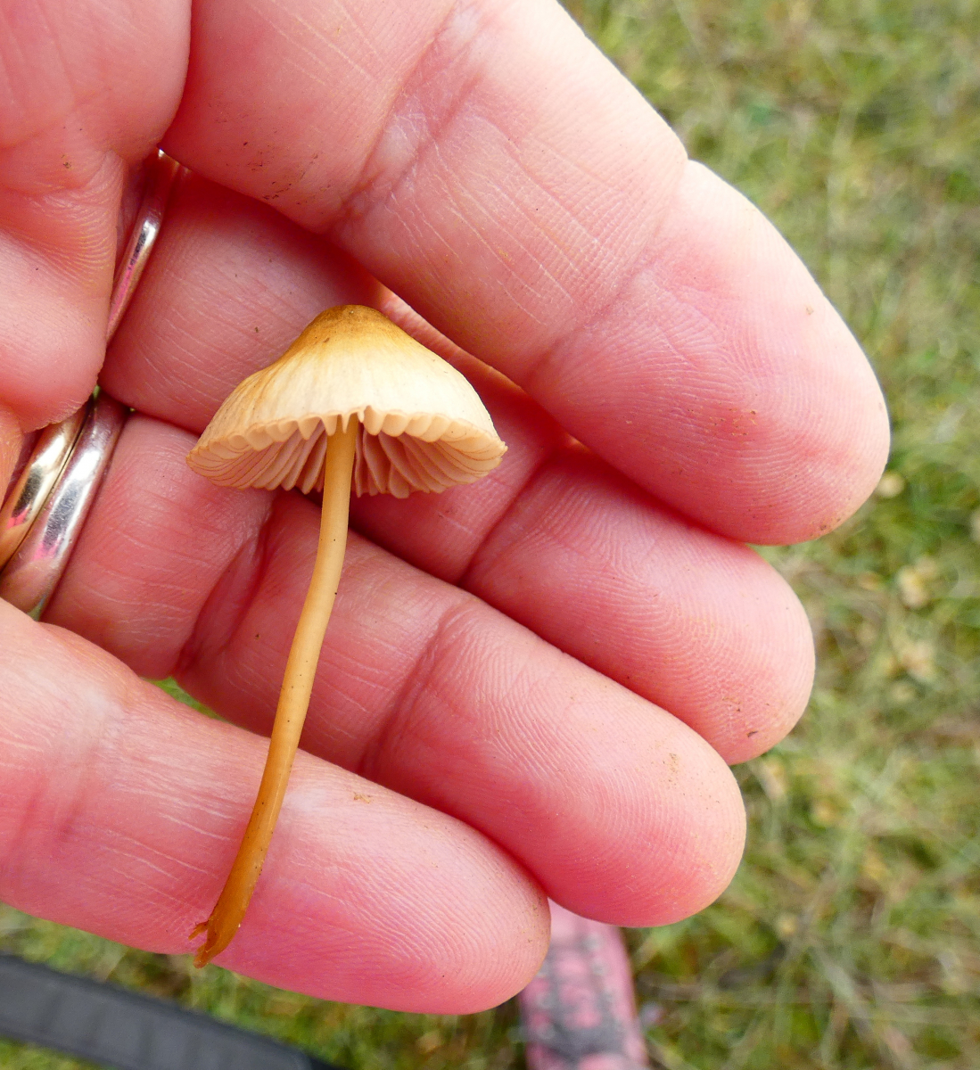 Pilz 4: Klein, braun, leicht kegeliger Hut, Mitte dunkler, Lamellen crème-gelblich...Mycena spec.?
