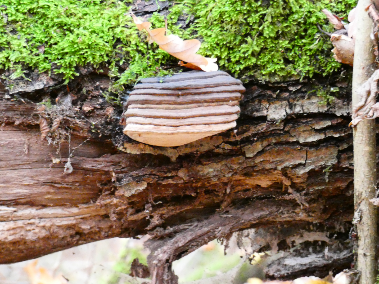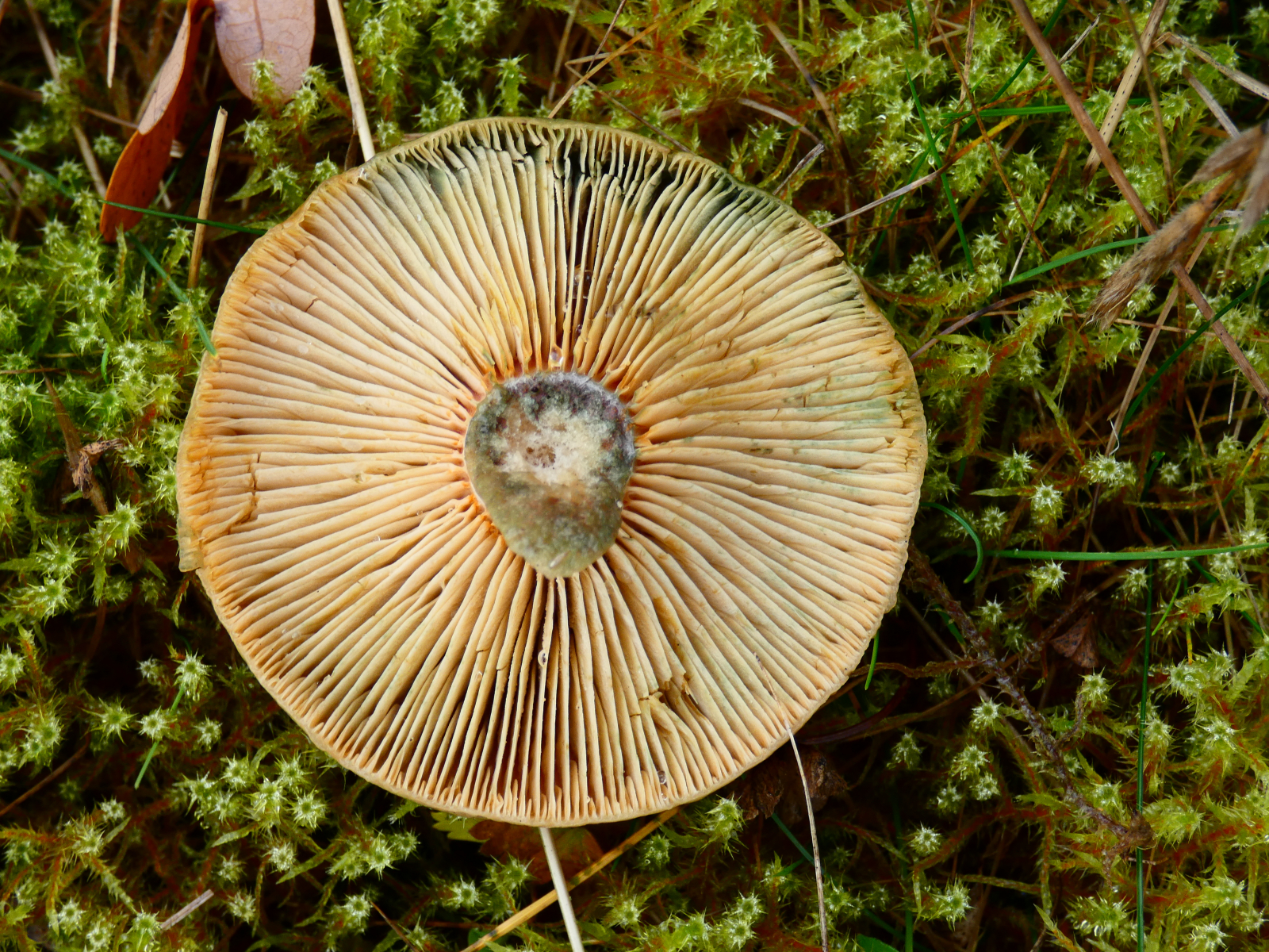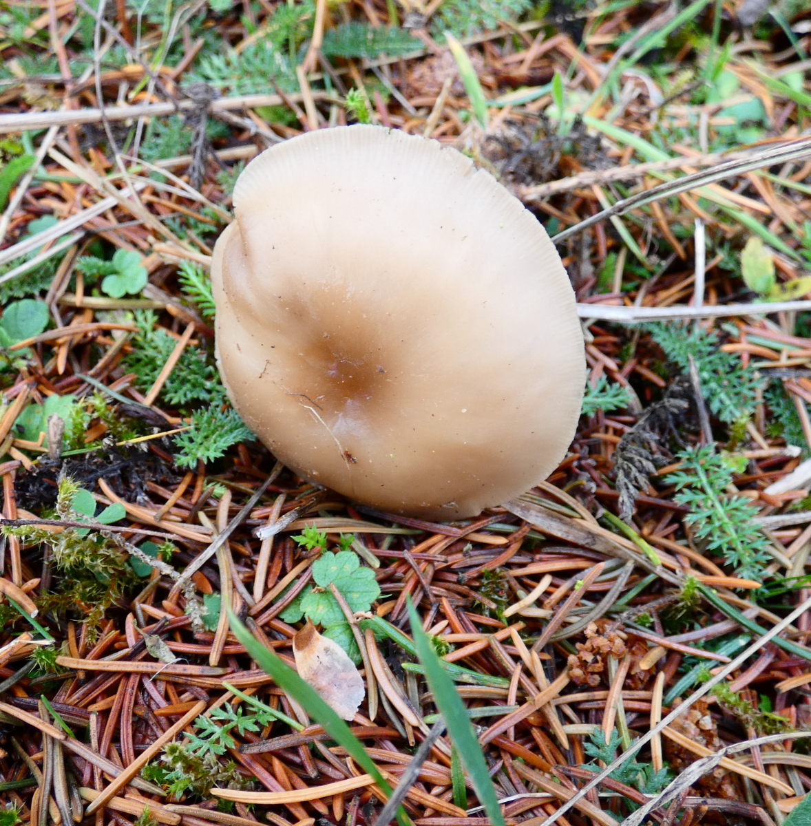 Pilz 6: Rübling? Hut relativ glatt, bräunlich gelb, Lamellen hell, untermischt.