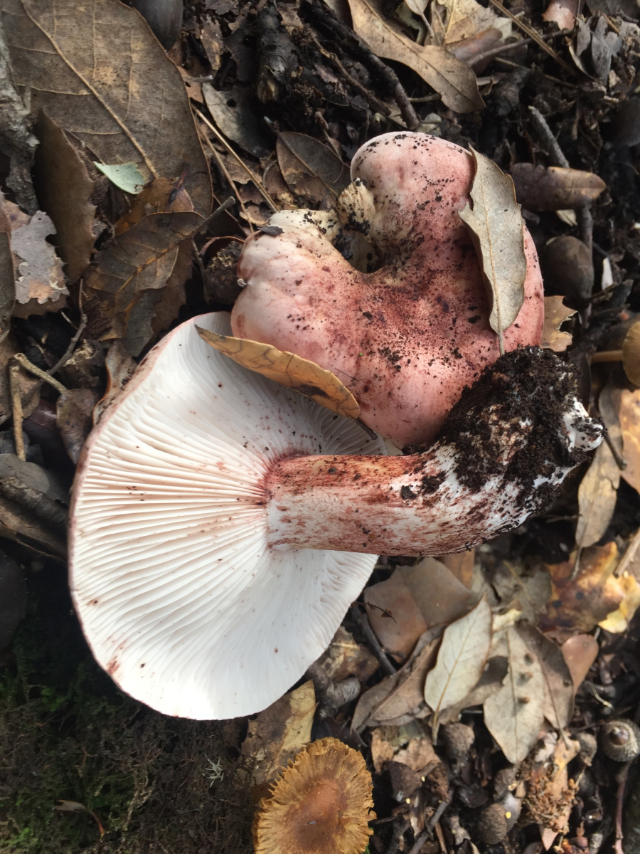 Tricholoma basirubens: Da bin ich sehr skeptisch. Man bräuchte immerhin noch die Farbe des Basismycels, den Geruch und müsste auch mal ein paar fruchtkörper über nacht liegen lassen, um Verfärbungen zu beobachten. Tricholoma atrosquamosum und Tricholoma orirubens sind ohne das nicht zu unterscheiden.