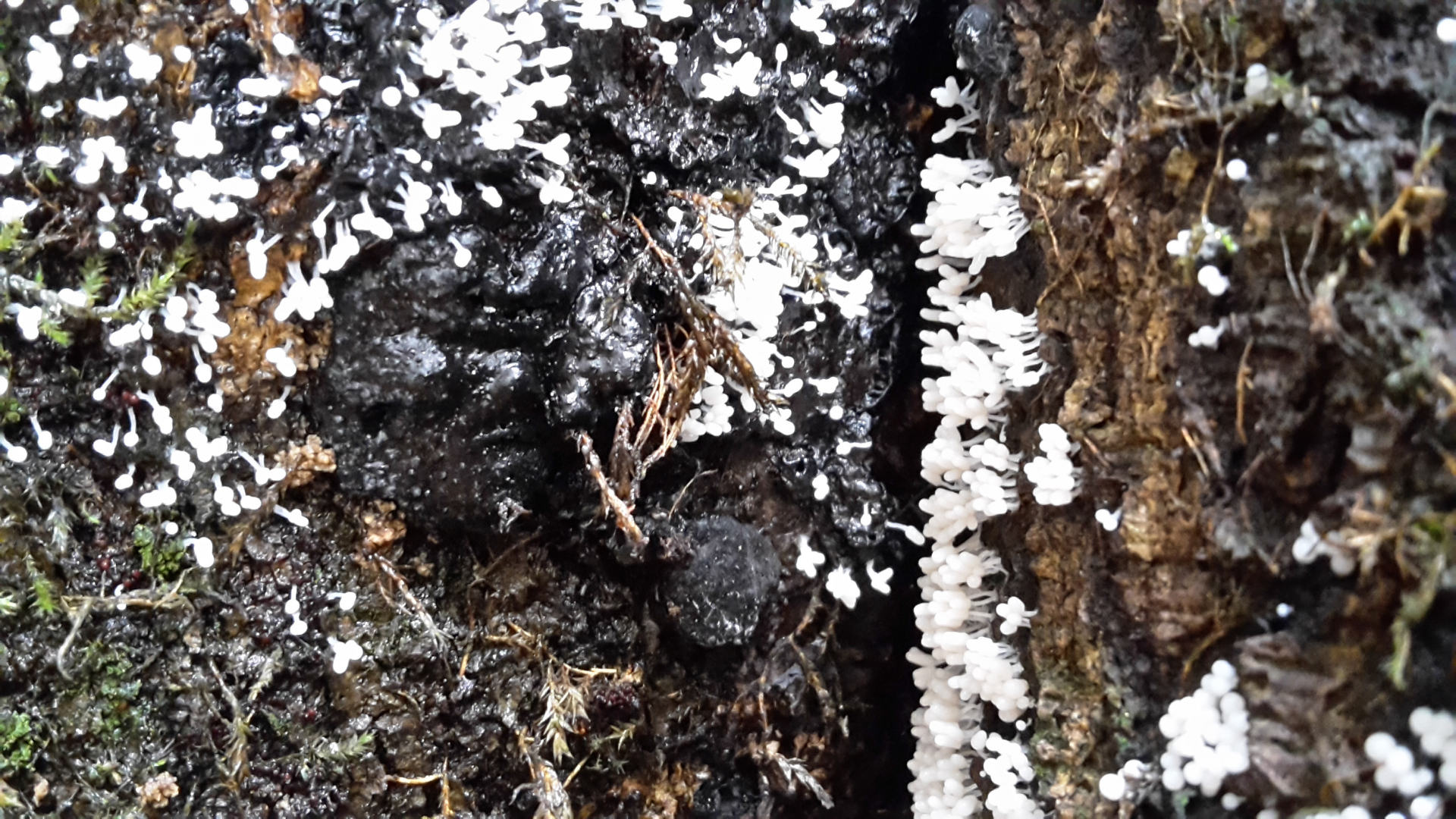Aber: Die kleinen, weißen Keulchen links, das dürfte eher ein Schleimpilz sein. Vermutliich aber unreif, und dann wird's kaum möglich sein, da zu einer Bestimmung zu kommen.