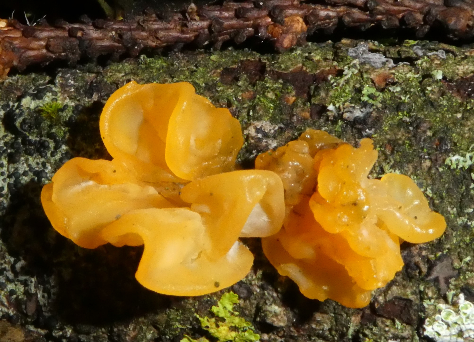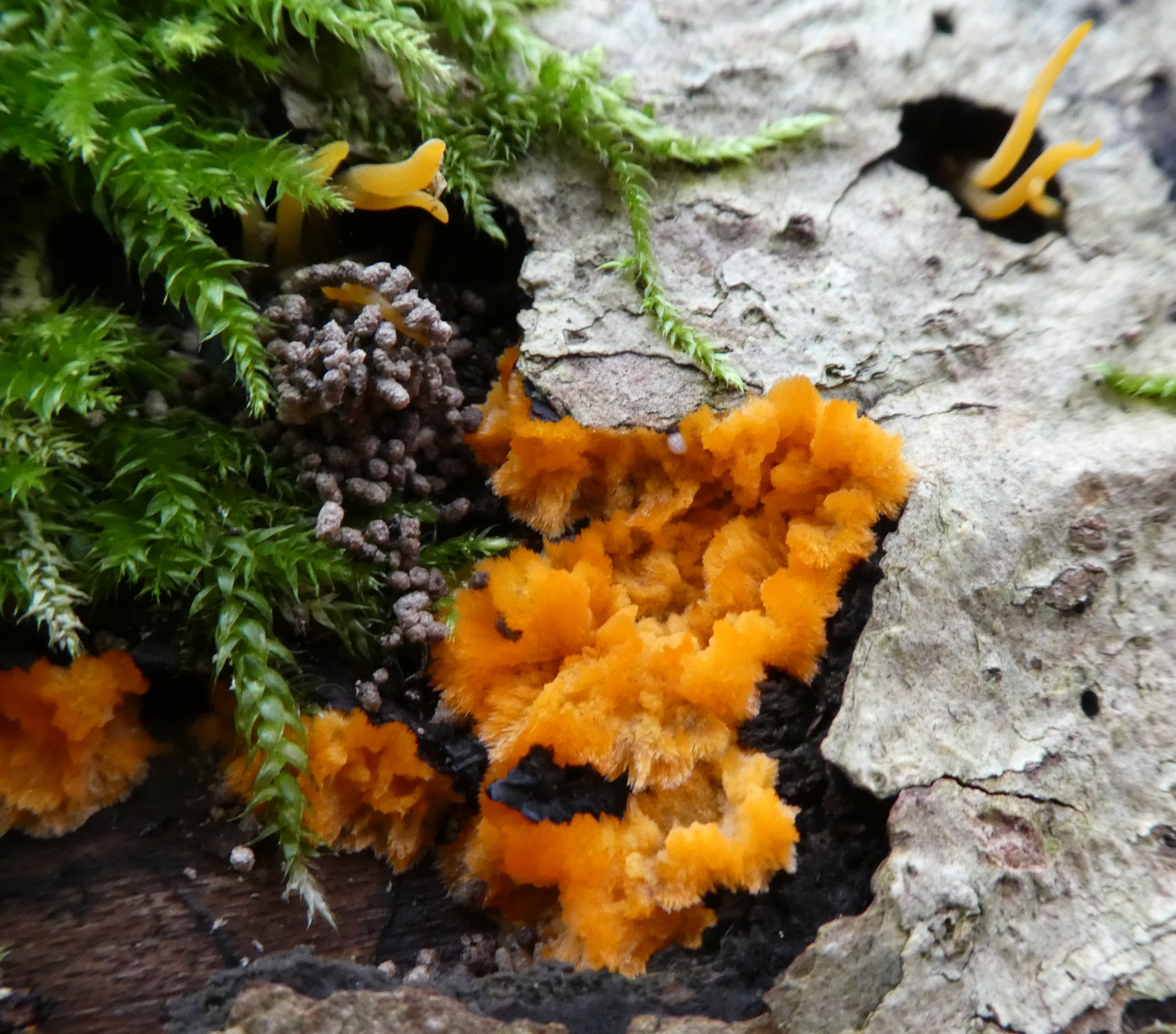 Orangeroter Kammpilz (Phlebia radiata) und Laubholzhörnling (Calocera cornea)