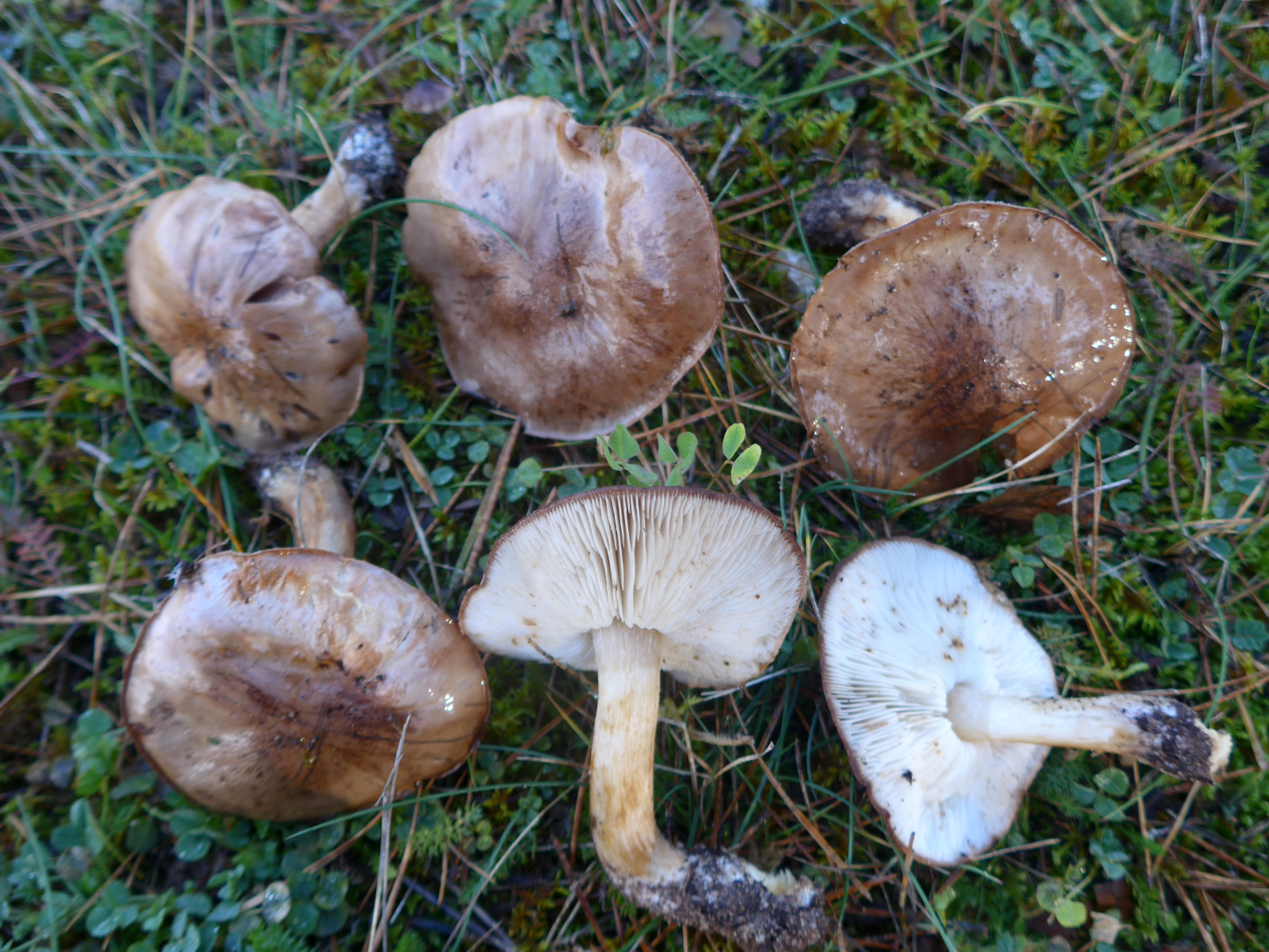 Hier wirds spannend: Brauner Ritterling bei Kiefer und Espe;, magerer saurer Sandboden, Geschmack bitterlich; Guajak leicht positiv. Könnte gut Tricholoma pessundatum - Getropfter Ritterling sein.