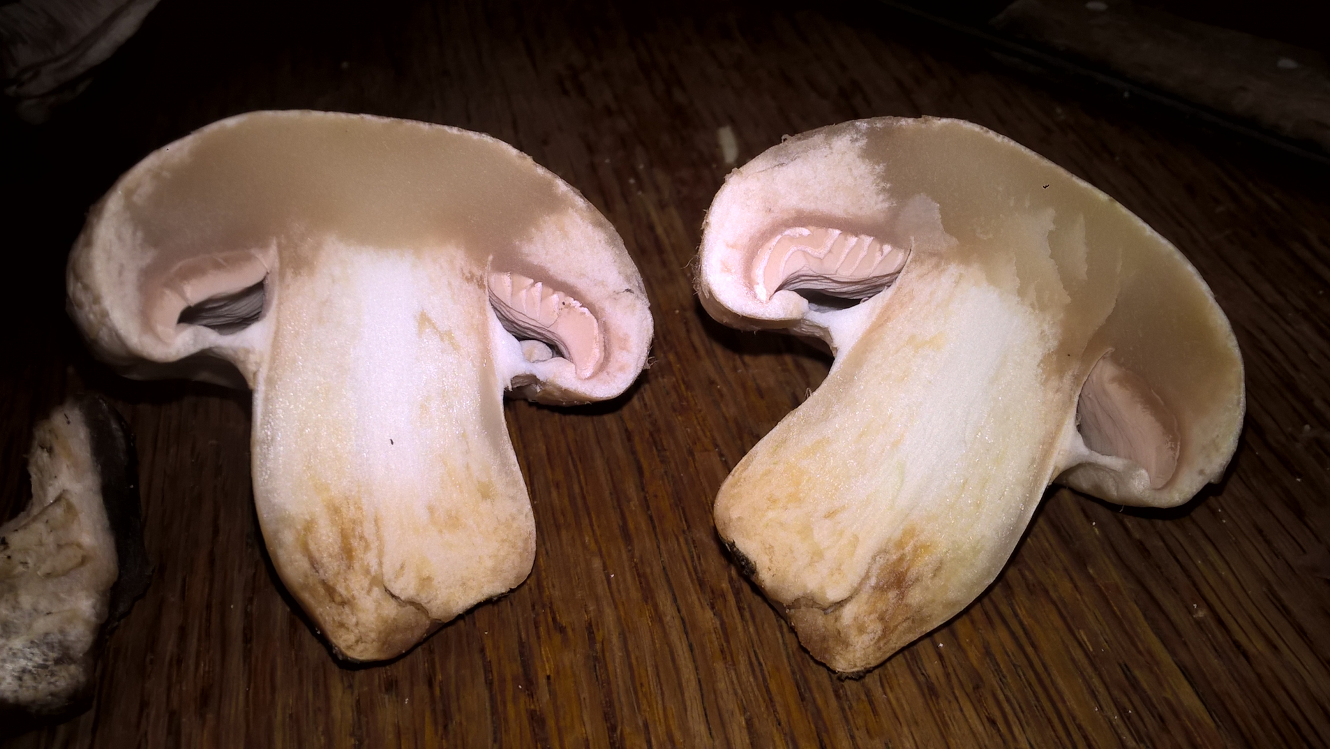 Ich würde übrigens auch vom Verzehr von Zuchtchampignons abraten, wenn die irgendwo gelblich anlaufen, auch wenn es vermutlich trotzdem Agaricus bisporus sein sollte, aber solche Verfärbungen wären dann auch ein Zeichen für fortschreitende Gammelprozesse.Insgesamt würde ich aber vor allem vom Verzehr von Pilzen abraten, die nicht richtig bestimmt sind.