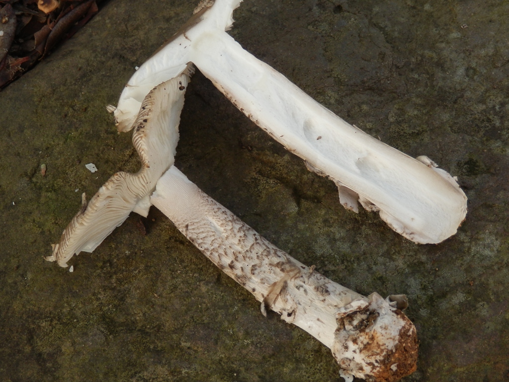 Stiel: ca. 14 cm, schlank, leicht konisch verdick zum Stielende, weißlich bei jungen und grau bei alten Pilzen, hohl oder gestopft