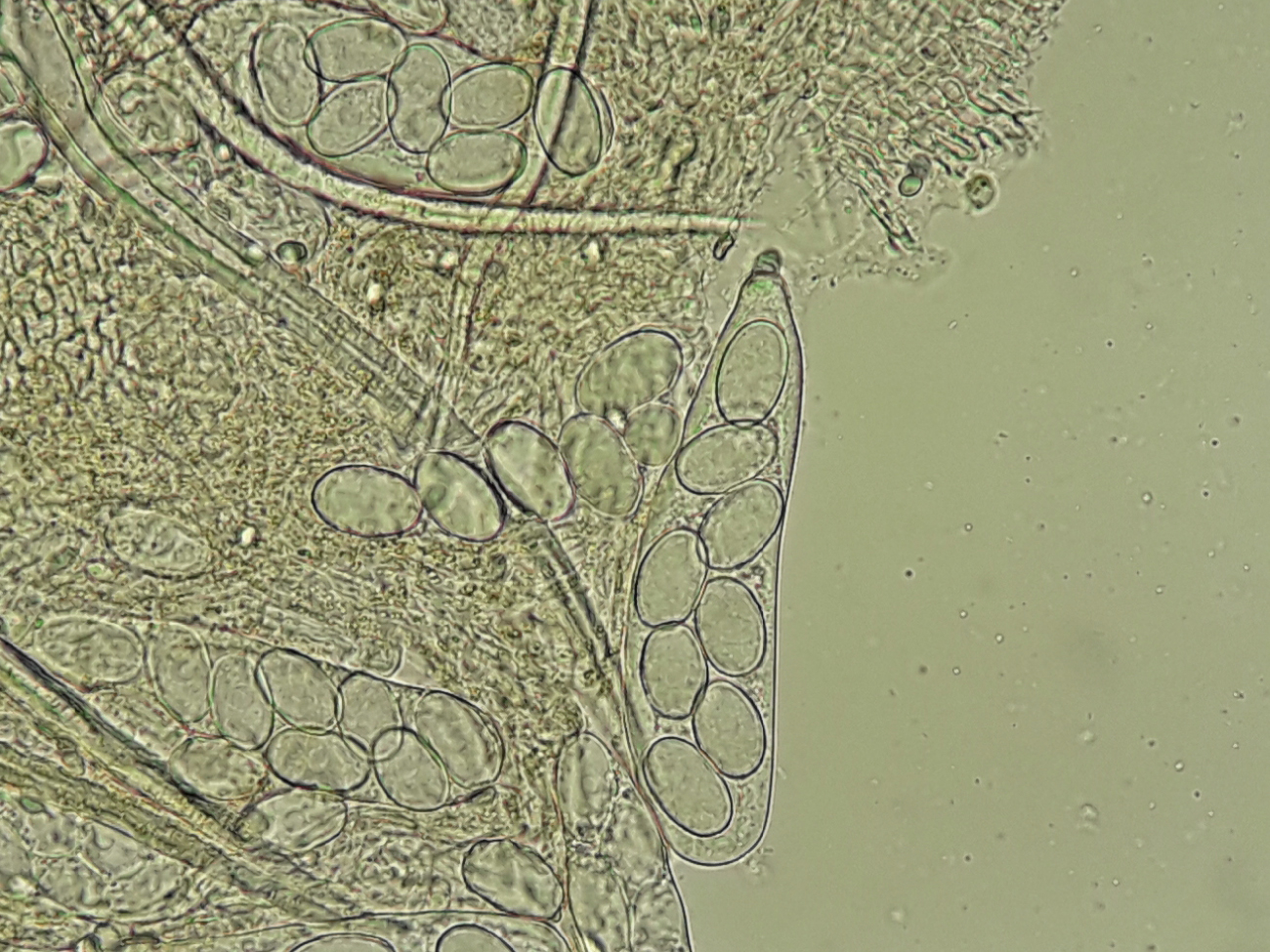 Paraphysen teils gerade und gegabelt.