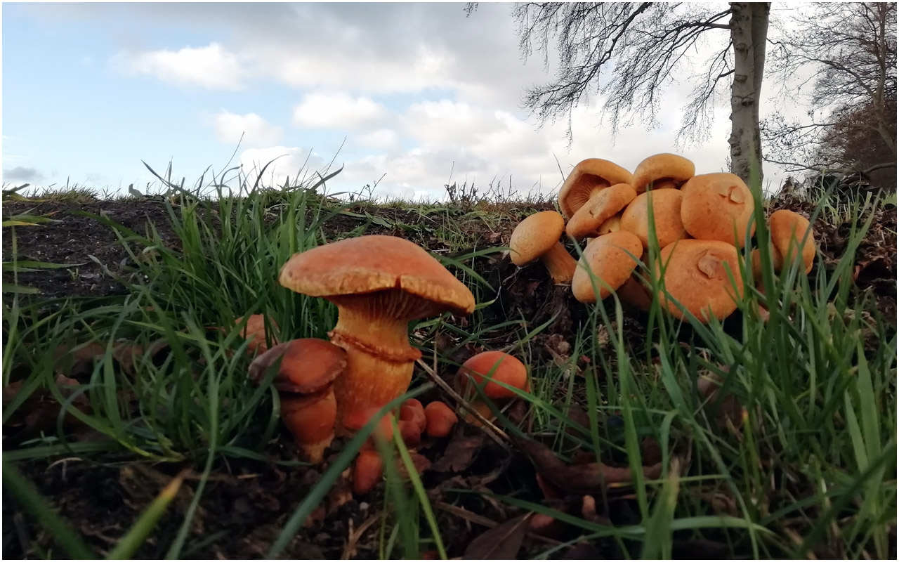 Weiterhin konnte ich noch eine Gruppe schön golden bis orange gefärbte Pilze entdecken, die ich aus der Ferne für Glimmerschüpplinge gehalten habe.