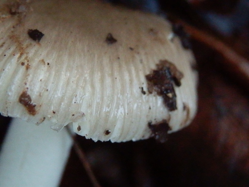 Hut: ca. 7 cm, glatt ohne Velumsreste, grau, dunkler in der Mitte, deutlich geriefter Hutrand, halbrund bei jungen Pilzen