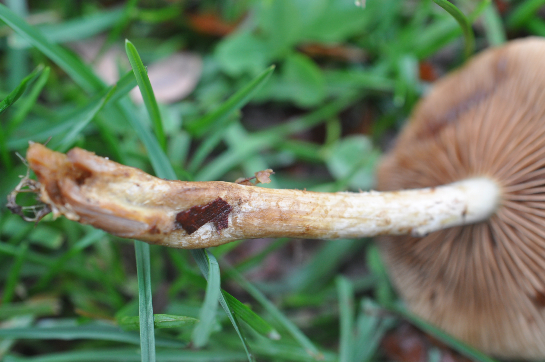 9. Hebeloma , drei Meter von See . Wegen Stiel - Wurzeln meine das um H. birrus gehet (kein Geruch) es gibt auch ähnliche H. radicosum aber riecht nach Marzipan .